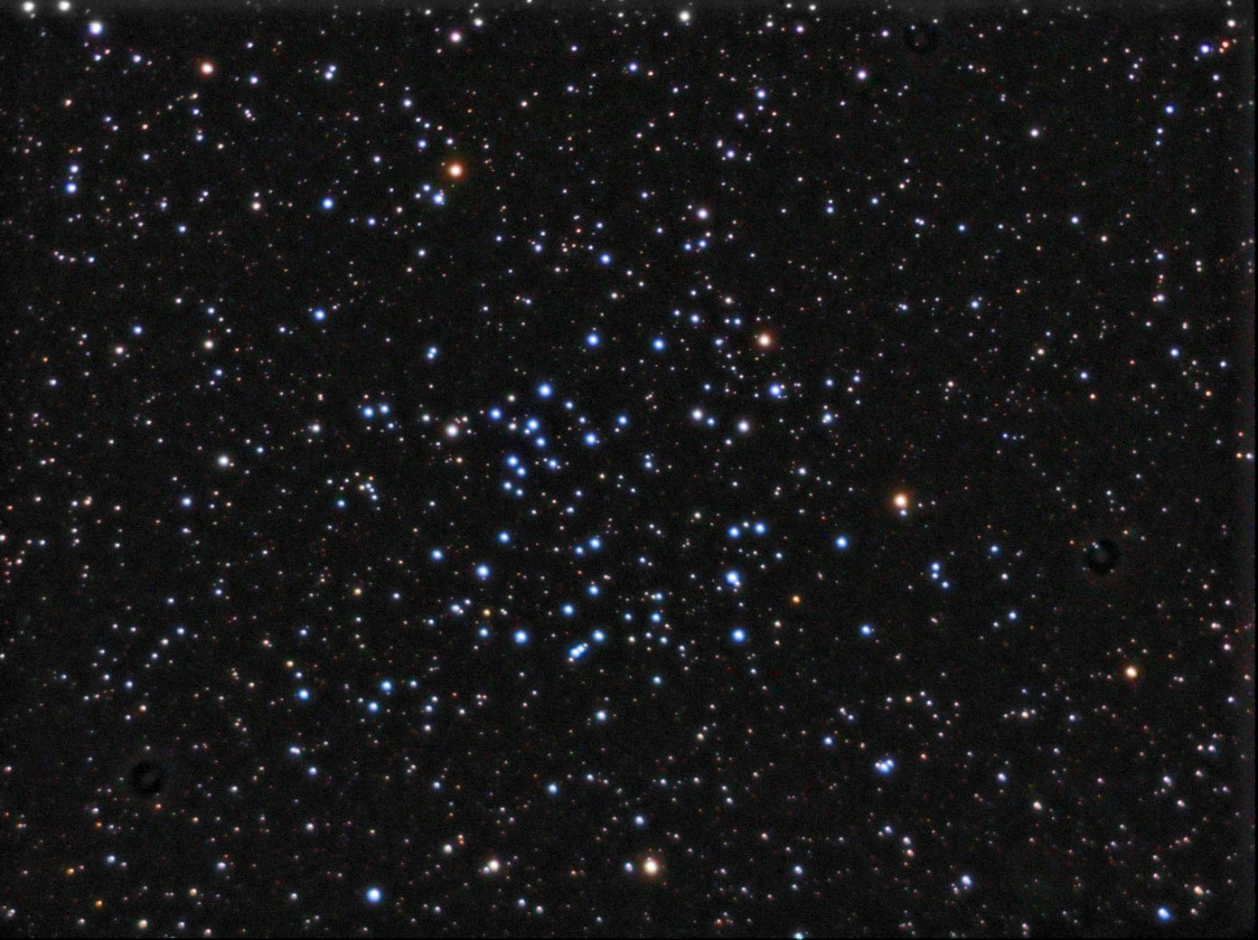 Je voudrais parler pour ma part d'un amas ouvert situé dans le cygne. NGC 6811 est située au Nord Ouest de l'étoile δ Cygni. Il a une magnitude apparente aux alentours de 7. Il se voit très bien dans une paire de jumelles, donc, pas besoin de diamètres démentiels. Il fait 15' d'arc. Je dirai qu'il vaut le détour.