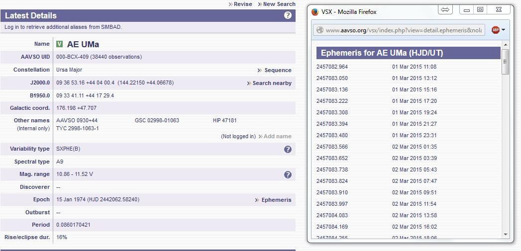 Deux éclipses de ton étoile sont enregistrées dans les données de l'AAVSO en date du 07 déc 2014. Tu peux récupérer les données ou la courbe de lumière et voir ainsi si la période donnée par le vsx est correcte. C'est le minima qui est indiqué.