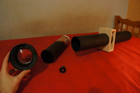 La conception est extrêmement simple, c'est 2 tubes qui s'emboitent ! le premier un tube de protection d'affiche porte la lentille de 80 mm d'une focale que je suppose de 60 cm (la ou mon image est nette) l'autre une boite de balle de tennis porte un oculaire récupéré sur un microscope! les 2 coulissent pour faire la mise au point . Elle est peinte intérieur et extérieure a la bombe noire . Que des matériaux de recupe cout 0 euro!