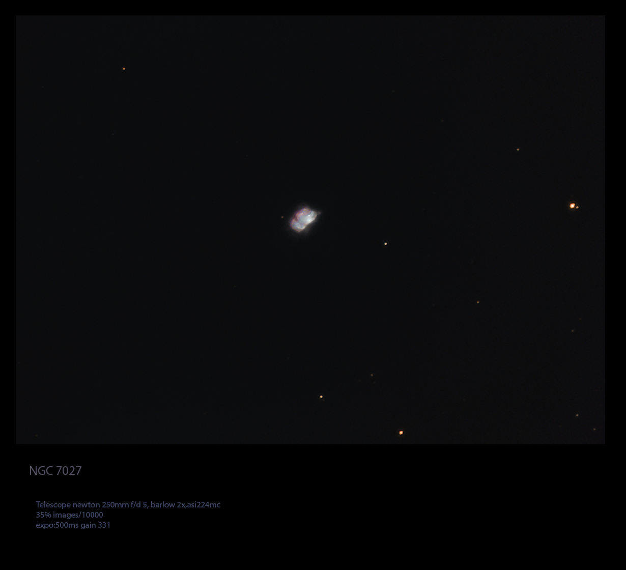 Ngc 7027 est une NP de 20" d'arc difficile, elle est très lumineuse (m 8.5) et sature rapidement les CCD dédiés au CP.