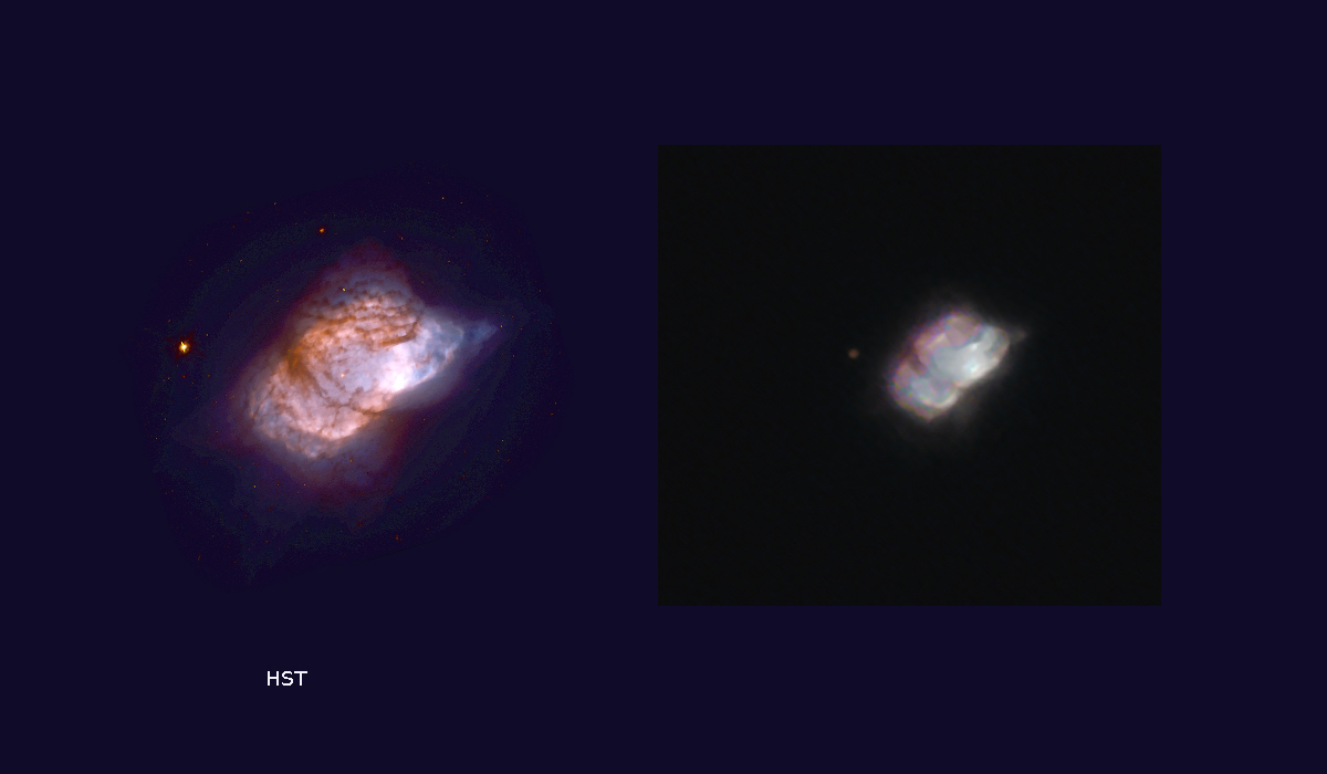 Les zones plus sombres en "peau de zébre" figurant sur l'image HST n'apparaissent pas sur ton image. Je pense que l'image Hubble est une composite de différents filtres, dont certains marquent bien ces zones plus sombres.