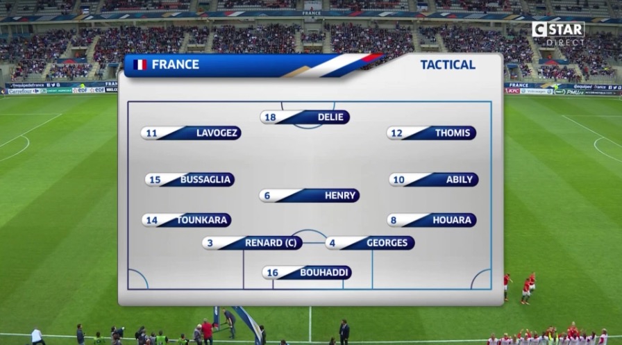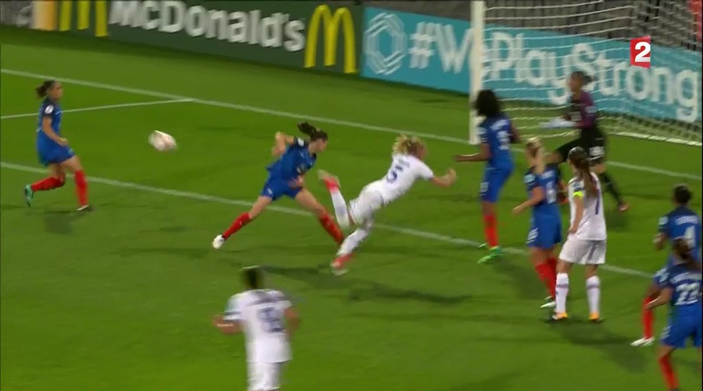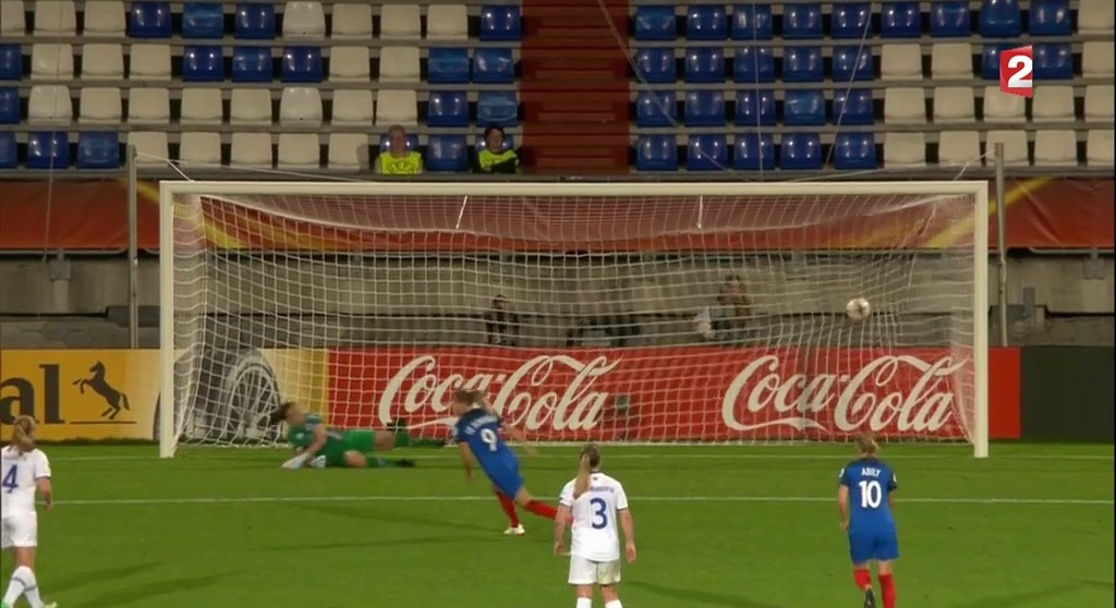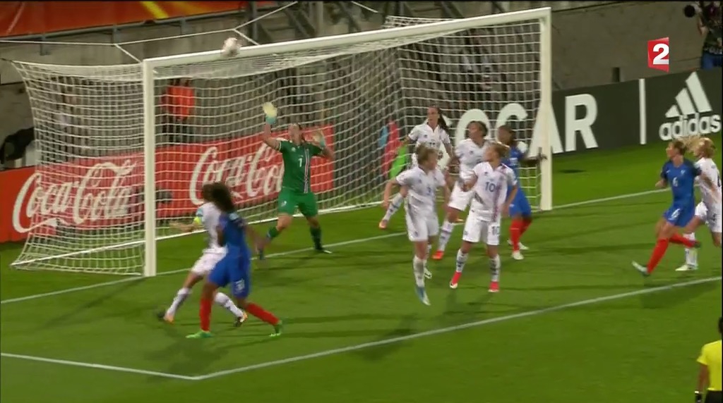 Domination française toutefois avec notamment une belle tête de Délie au deuxième poteau suite à un enieme joli centre de la droite de Thomis.
