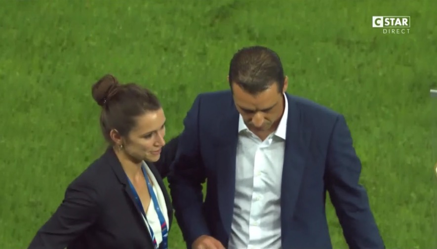 Le sélectionneur Olivier Echouafni en compagnie d'une conseillère avec qui il a discuté tout le long du match ;)