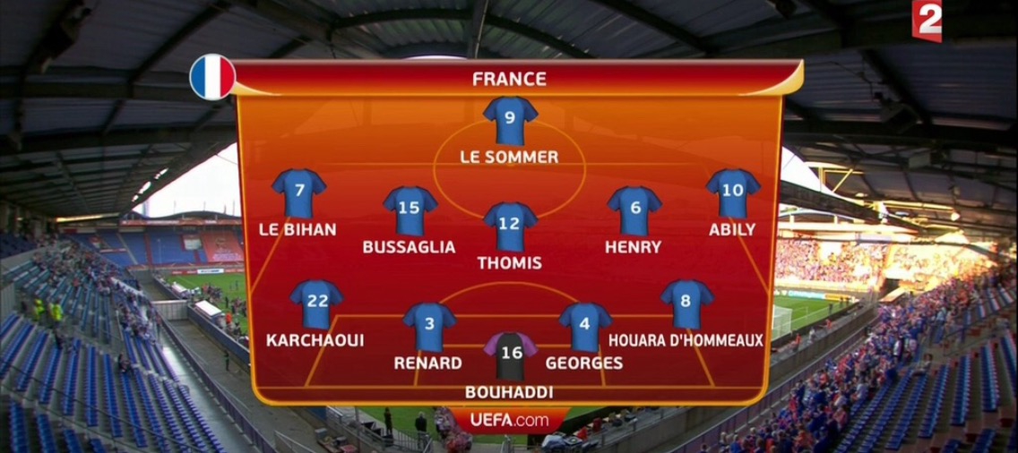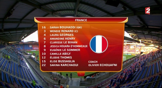 J'ai bien cru voir Méline Gérard mais non encore une fois c'est Sarah Bouhaddi dans les buts comme toujours. S'il y a un point commun entre Echouafni et son prédécesseur Bergeroo c'est bien celui-là : les gardiennes remplaçantes ne jouent pas (ou à la rigueur Méline Gérard une fois l'an, mais alors Laetitia Philippe...). Sont plus compétents que moi mais tout de même je trouve cela curieux, bon...