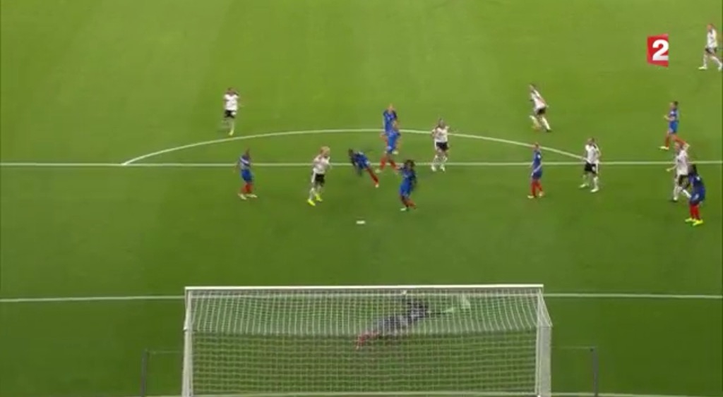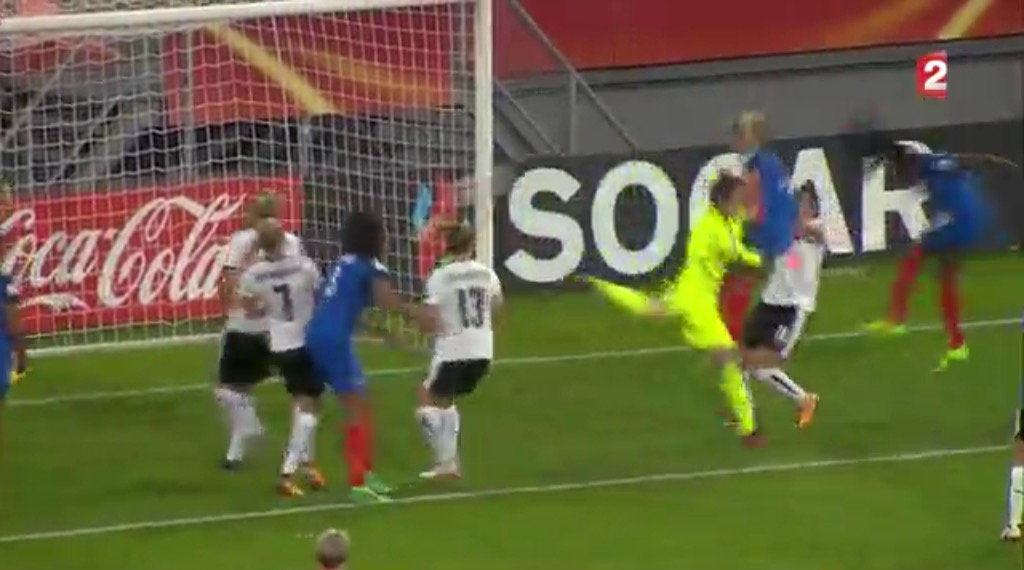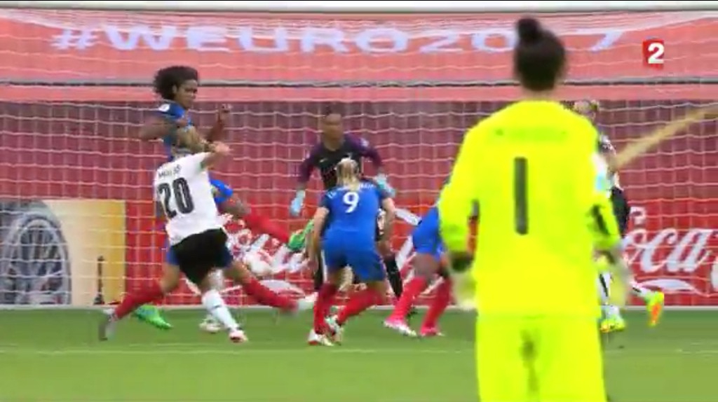 Punaise sur corner une puissante tete allemande qui oblige la gardienne à dévier miraculeusement le ballon sur la barre transversale :o !!