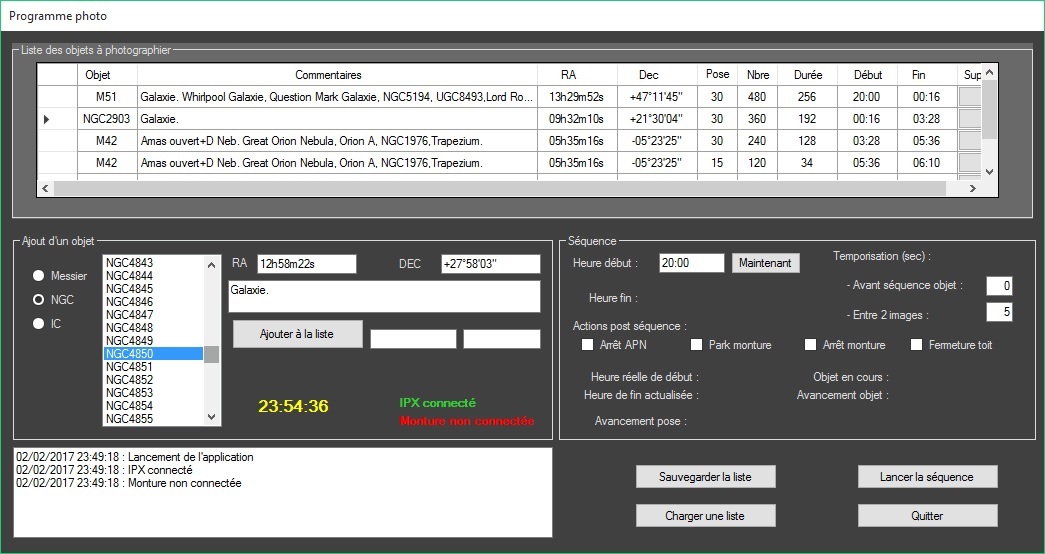 Aujourd'hui, j'ai un programme qui me permet de lister les objets que je veux photographier et une fois lancé, la monture est intégralement pilotée. Il a fallu adapter les catalogues d'objets (M et NGC pour le moment) pour pouvoir disposer des coordonnées de chaque objet. Quelques fonctionnalités post-séquence sont également présentes (mise en position park de la monture, coupure alimentation APN, ...).