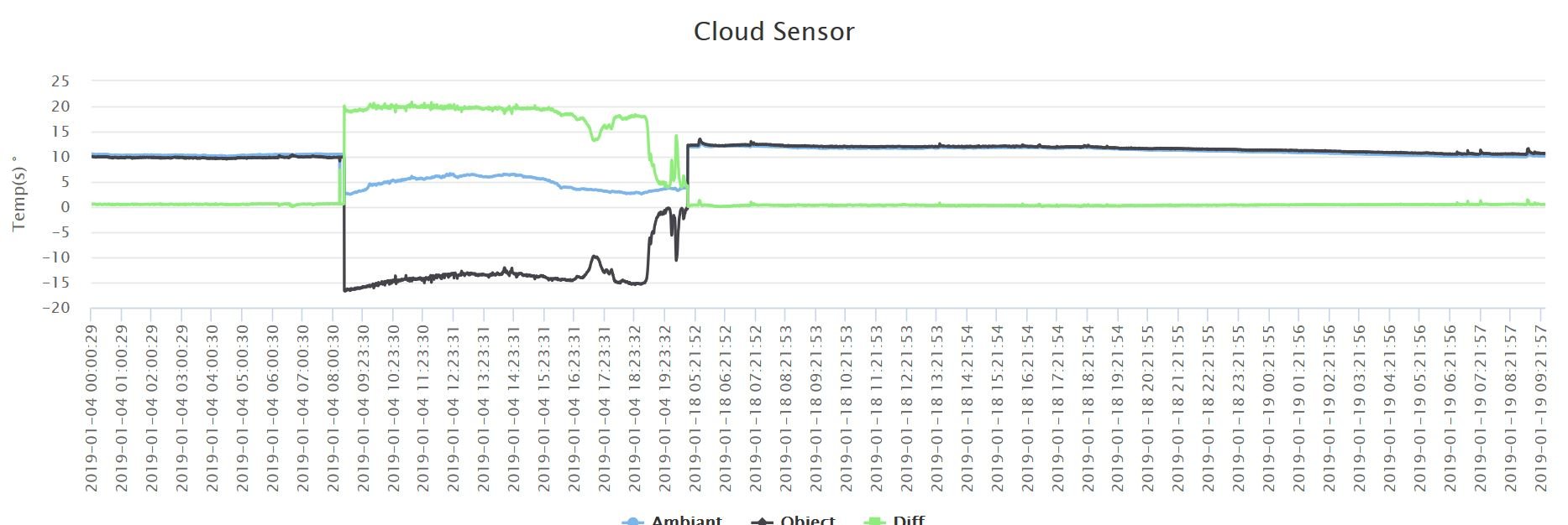 Un graph en exemple : plus la T° calculée de la courbe verte est haute plus le ciel est dégagé les oscillations représentent les passage nuageux. C'est un bon complément à la allsky.