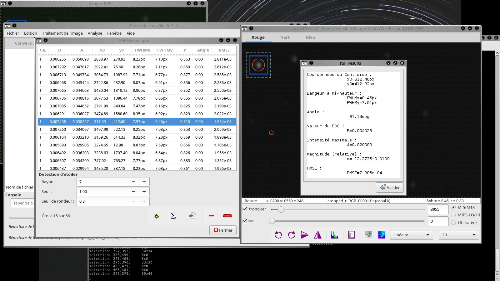 alphamax Posté 11 mai 2017 Posté 11 mai 2017 (modifié) Bon ben ton autre bug est corrigé. Merci pour tes rapports de bugs. Merci Cyril Je viens de vérifier, ça tout bon. Tiens, j'en ai un autre sympa : 1) je sélectionne une petite zone avec quelques étoiles 2) je demande une psf de la séquence 3) je sélectionne une étoile seule et je redemande une psf de la séquence 4) et j'obtiens : Remarque, je trouve ça très jolie Quand on demande que la psf (seule), il y a une popup pour dire que la sélection est trop grande, mais pas pour la psf de la séquence (par contre, on a bien le message dans la console). Un autre truc que je trouve bizarre (mais peut être que tu vas me dire que c'est normal). 1) je demande une analyse psf dynamique 2) je sélectionne une ligne dans la liste => un carré bleu entour l'étoile en question (d'ailleurs, le bleu pas facile à repérer sur fond noir) 3) dans l'image, je sélectionne l'étoile pointée par la psf dynamique 4) je demande la psf de l'étoile (oui, je sais c'est tordu) et j'obtiens des valeurs différentes : Bonne soirée. Christian Modifié 11 mai 2017 par alphamax