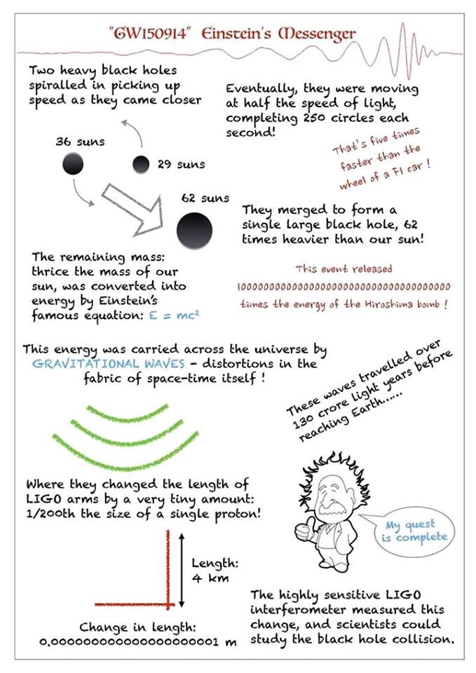 Passionnant ce dossier. on y lit que lors de la fusion des deux trous noirs une quantité d'énergie correspondante à 3 masses solaires fut envoyé dans l'espace sous forme d'ondes gravitationnelles en une fraction de seconde : on imagine mal la quantité d'énergie émise.... sachant que ceci c'est produit il y a 1,3 milliard d'années. Je suppose que ça a du tanguer pas mal aux alentours !