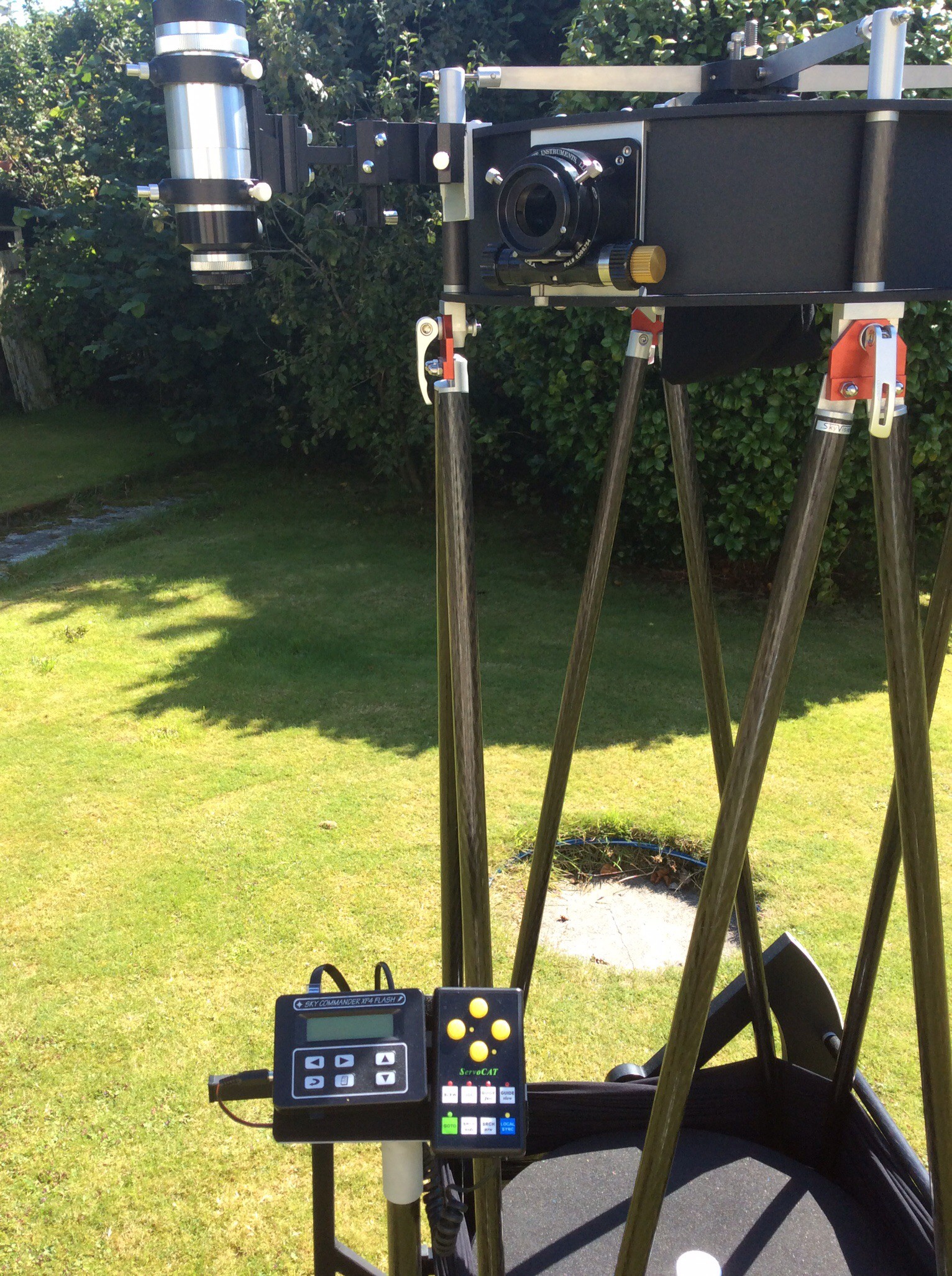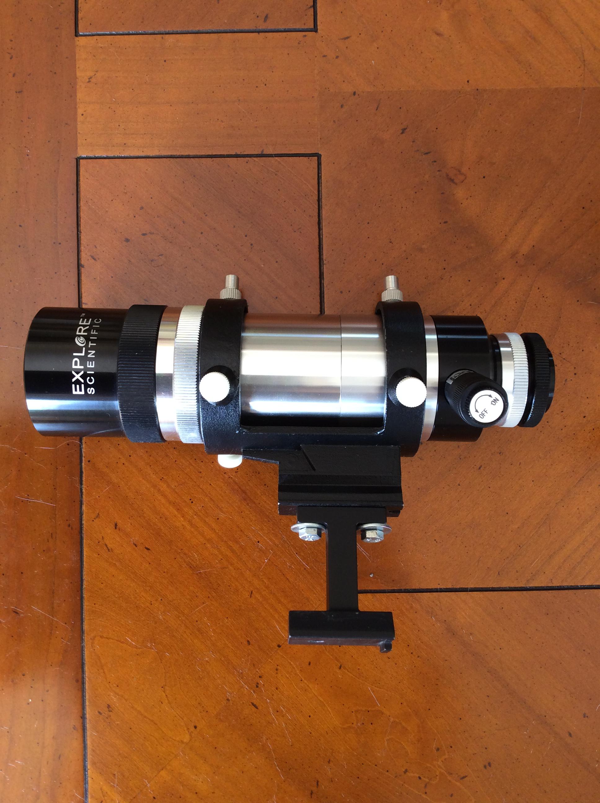 Je l'ai doté d'un chercheur qui ne rend pas fou. Le chercheur droit 8x50 à vision totalement redressée de chez ES. Un vrai bonheur. Je l'ai installé sur un support qui le décolle un peu du tube pour éviter les contorsions. A noter que ce chercheur est aussi doté d'un éclairage, avec des graduations tous les 0,75°. Je le recommande chaudement.