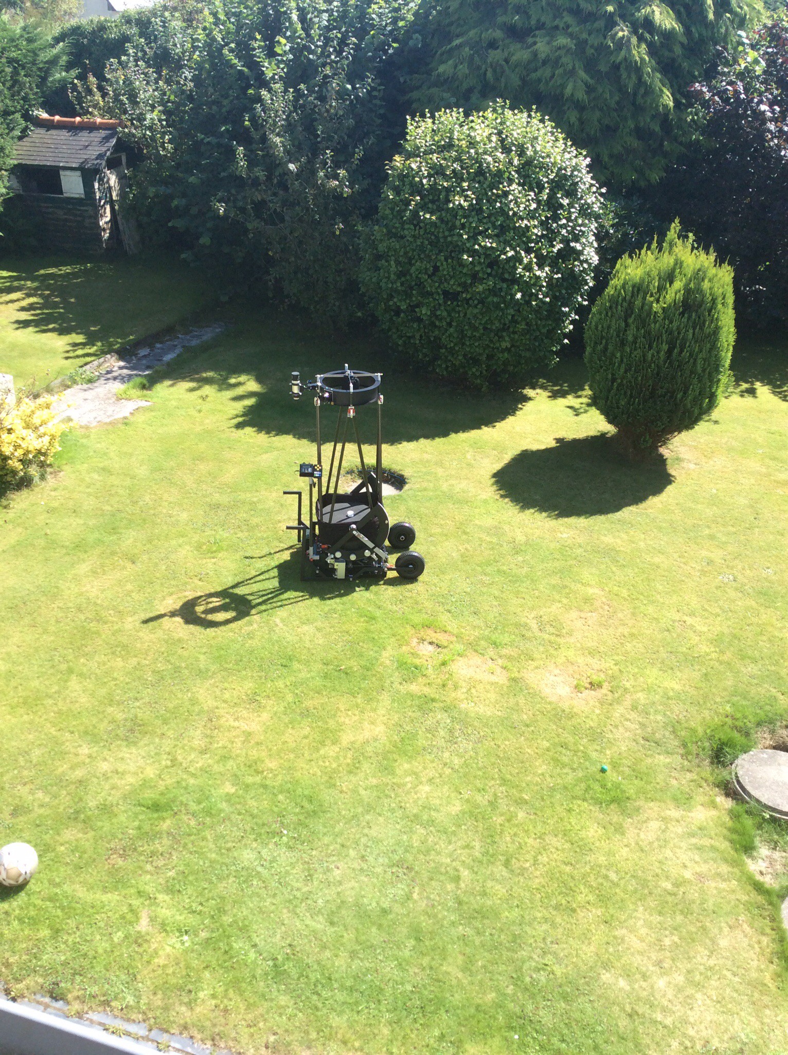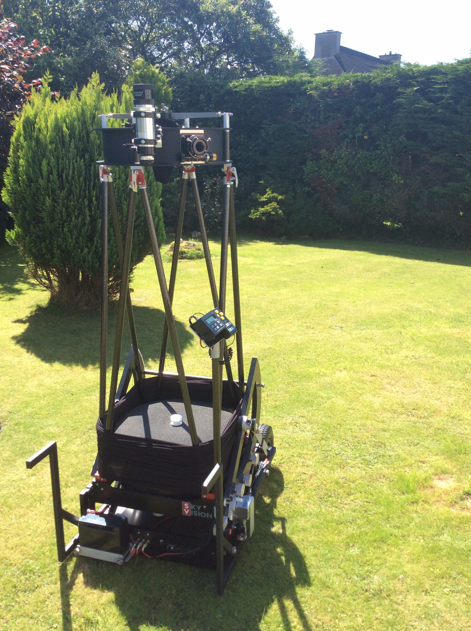C'est un télescope que j'utilise essentiellement à mon domicile donc il n'est jamais démonté. Il est donc pourvu d'une brouette qui me permet de le sortir en moins d'une minute et d'être opérationnel très rapidement.