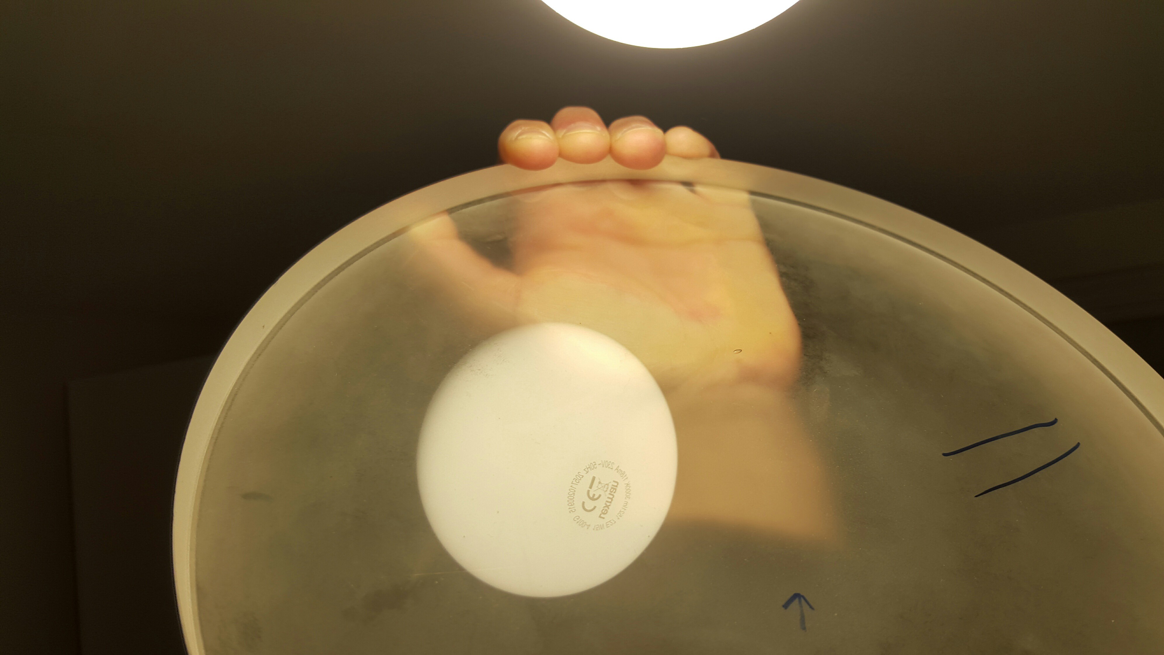 Quand je regarde le miroir , je vois bien la led verte qui est petite , puis je recule mon Foucault et l'image de la source grossit pour remplir toute la surface du miroir , qui parait uniforme. Quand je décale mon œil légèrement du coté de la lame , je vois aussi le couteau qui rentre dans le miroir du même coté que ma lame. Mais en reculant davantage l'appareil , l'image devrait s’éteindre uniformément quand je serai au ROC du miroir et après on aura le couteau qui apparait de l'autre coté , chose que je n'ai pas du tout.