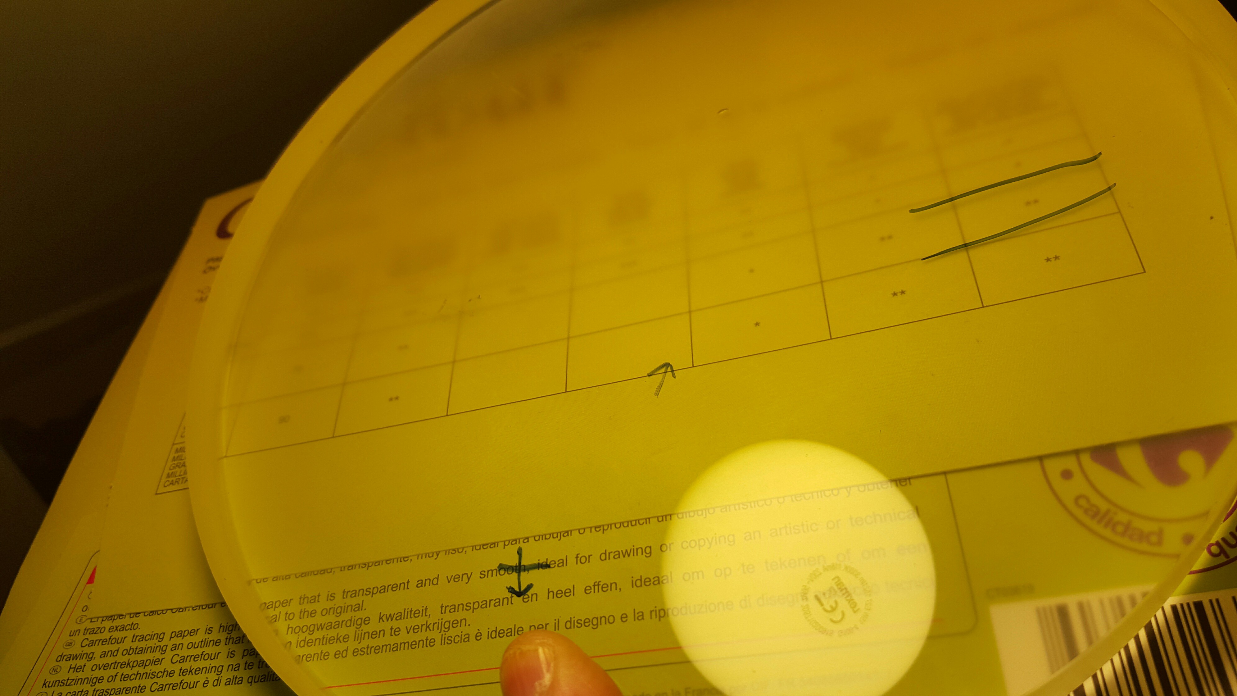 J'ai encore poli 3 heures. Je suis à 7 heures de polissage. L'examen de la surface à la loupe ne retrouve plus de grains visible, d'ailleurs la face n'est plus visible, je suis obligé de chercher une poussière ou une trace pour pouvoir régler la loupe, sinon je mets un bout de papier sur la surface, autrement c'est très difficile d’accommoder sur la surface. Par contre , le test au laser n'est pas concluant, je continue de le voir sur la surface mais la lumière est faible. pour les filandres , elles sont encore là même si elles ont diminué.