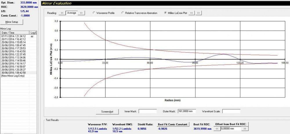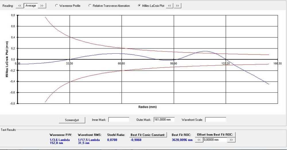 L'astuce de Franck en mettant un anneau de papier sur la zone qu'on veut préserver lors du pressage est terriblement efficace !!!!!! ça a marché à plusieurs reprises sur la zone extérieure 6 , mais ça devenait compliqué pour mon niveau dès qu'il y ' a 2 ou 3 zones à respecter. Donc je suis revenu vers la sphère (enfin pas complétement ,je me suis arrêté quand j'ai eu un tirage de 1.8mm environ avec des correction entre 20 et 30% , puis j'ai fait 2 séances de parabolisation de 10 et 15 min. Je n'ai pas amélioré le Lambda mais le vrai problème est que j'ai l'impression que le miroir est zoné. Quand je fait des lectures sur 2 axes différents , j'ai parfois jusqu'à 0.22mm de différence, je crois que c'est énorme, j'aimerai bien avoir votre avis ?