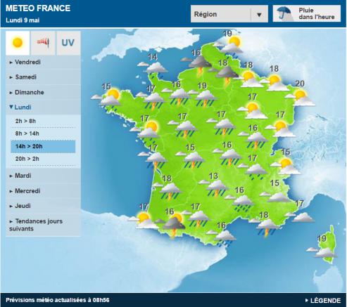 par curiosité j'ai regardé, dans les archive sur Info climat, le temps qu'il faisait sur Lyon tous le 9 Mai sur la période 2008 ===> 2015 (soit 8 ans) é bin c'est pas fameux :confused: avec un ciel ce jour là souvent couvert voir pluvieux !