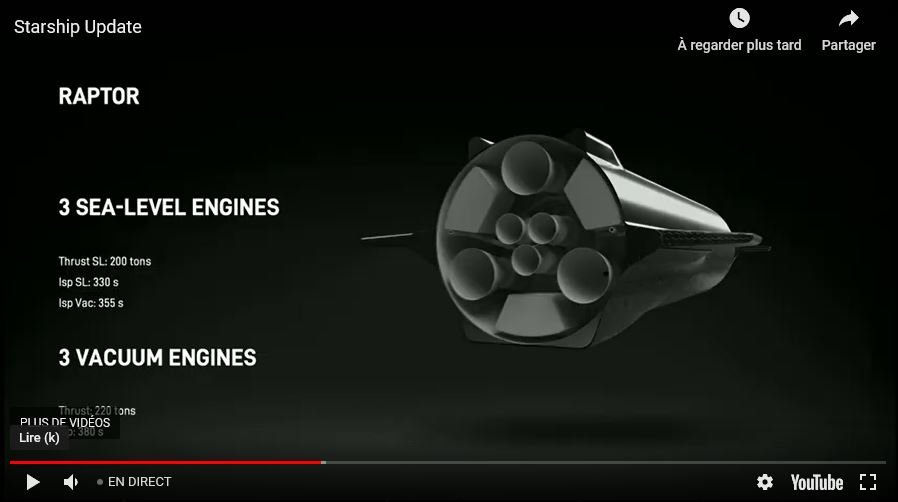 Remarque : Contrairement au schéma d'artiste ci-dessus où le Starship a trois ailerons ... il n'y en aura que deux sur le prototype qui est en fin de construction à Boca Chica (Texas)