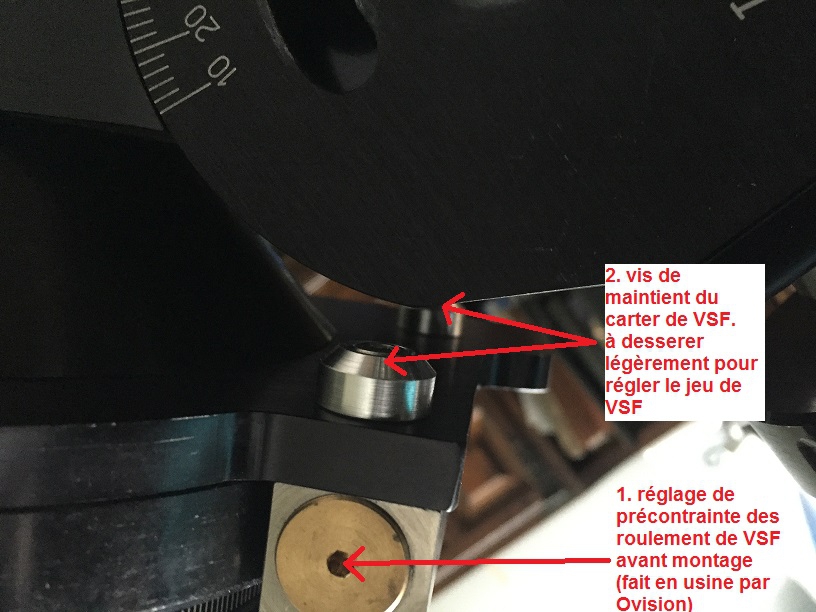 C'est une bonne nouvelle, si tu as la vis Ovision, car elle est de grande précision et tenue par un carter monobloc beaucoup plus fiable et beaucoup plus facile à régler. Ce carter permet de maintenir les 2 roulements de VSF bien dans l'axe, permet de les pré-contraindre correctement (réglage très fin) et permet de régler l'ensemble bien tangentiellement à la couronne, ce qui est quasi impossible à faire avec le montage d'origine losmandy en 2 parties.
