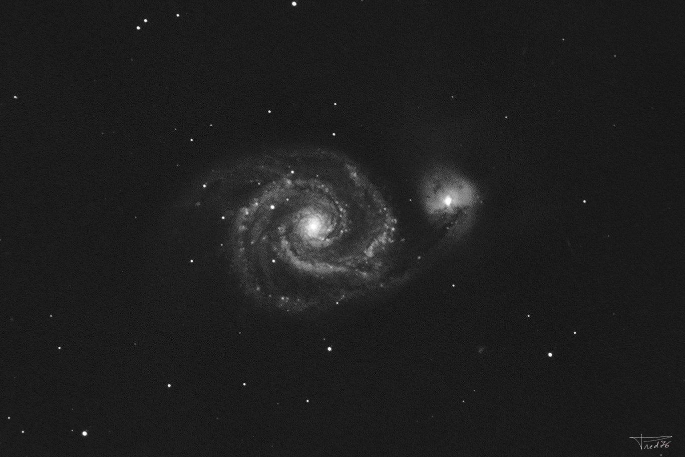 Voici l'image de M51 prise par nuit de pleine Lune depuis Sainte-Foy-Tarantaise (Savoie), à 1550 m d'altitude. La photo a été réalisée à partir de deux séances de prises de vues, les 16 et 17 juillet dernier avec mon Newton 200/1000 sur Az-EQ6 (autoguidage au DO avec une QHY5L-IIm, correcteur de coma GPU).