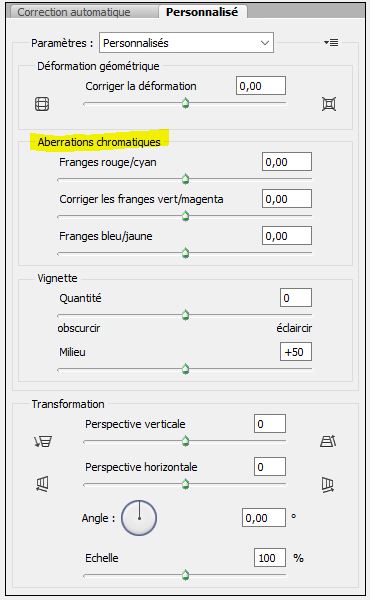 Filtre>Correction de l'objectif>onglet "personnalisé" est là tu à "aberrations Chromatiques"