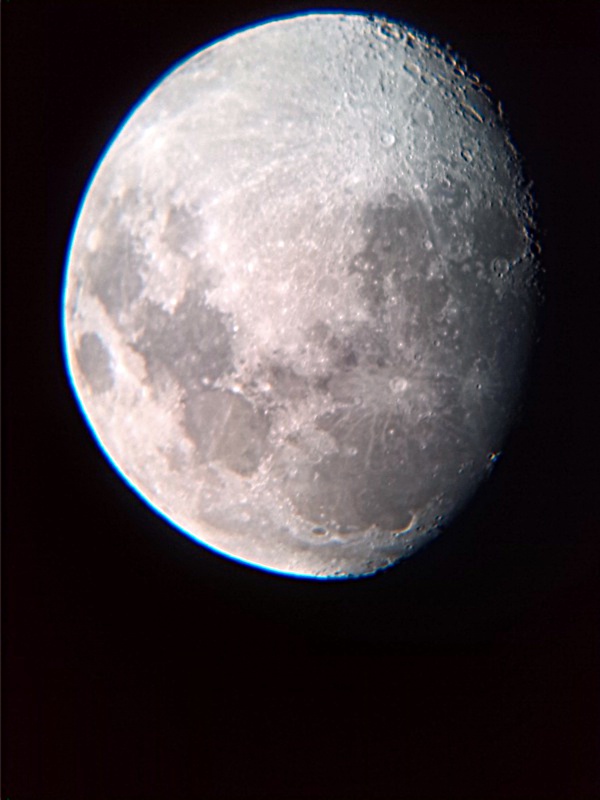 Alors voilà comme je pratique seul, j'aimerai juste pouvoir partager de temps en temps mes observations de manière "grossière" sans que les images soient formidables nettes précises colorées. Juste pour montrer de l'à peu près ce que j'observe. Donc sans que cela nécessite des temps de pause longs et du matériel onéreux. Voici par exemple une photo de la lune faite juste avec mon téléphone bon marché placé sur l'oculaire (galère à centrer lol mais faisable), ça me suffit comme qualité c'est donc juste pour montrer.