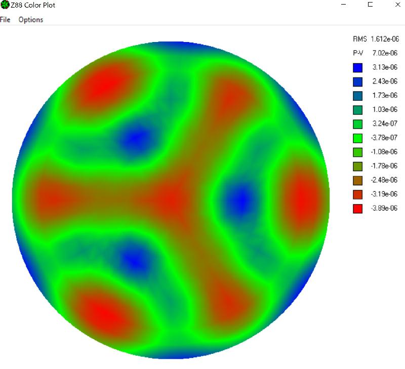 C'est nickel (erreur RMS 1,6nm sur la surface, Strehl à 0,998x de la valeur pour un barillet parfait). À noter qu'il faut que la distance entre les points extrêmes des triangles soit légèrement plus grande que celle entre les points de deux triangles adjacents, sinon le miroir s'affaisse plus entre les triangles qu'au dessus d'un triangle (c'est une erreur que j'ai d'abord faite...)