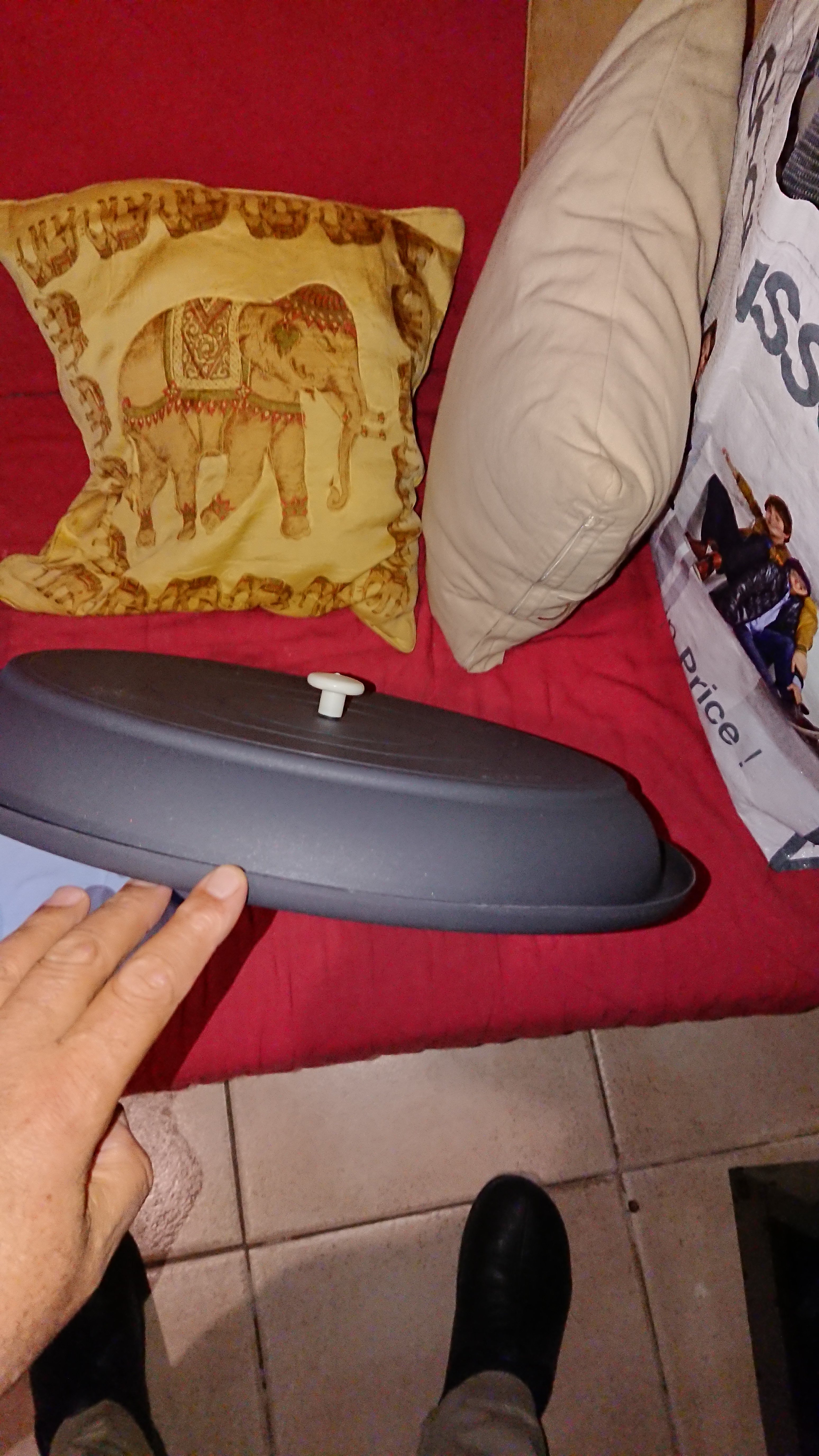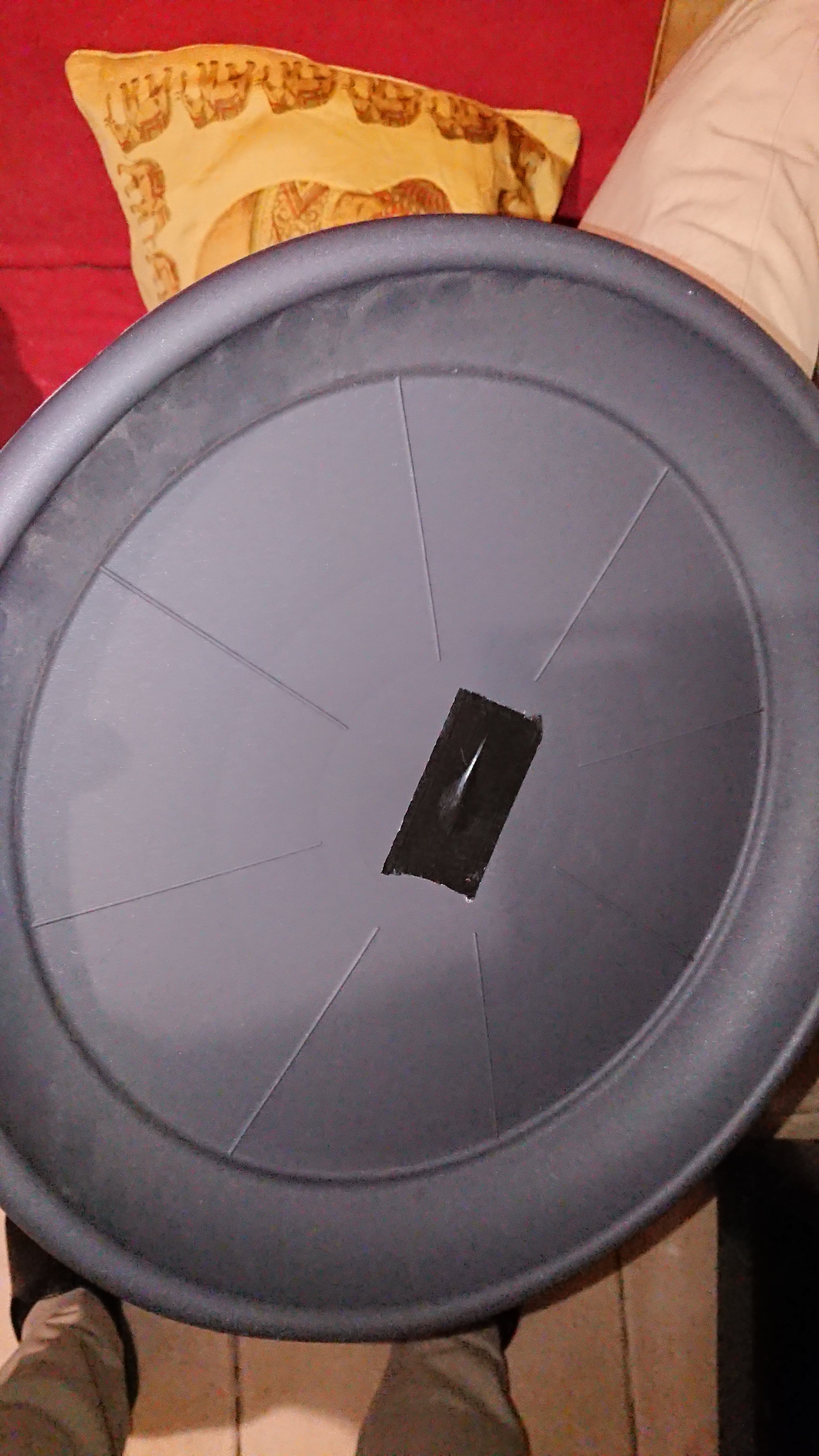 J'ai trouvé ,chez Jardiland une coupelle "à eau" de pot de fleur en plastique de 52 cm de diamètre à 6.90 €. J'ai rajouté un bouton de "poignée de Porte" à 1 € chez Brico Dépot, visser au centre, et me voilà avec une protection du primaire.