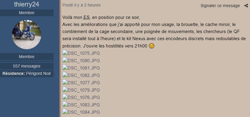 Avec les améliorations que j'ai apporté pour mon usage, la brouette, le cache miroir, le comblement de la cage secondaire, une poignée de mouvements, les chercheurs (le QF sera installé tout à l'heure) et le kit Nexus avec ces encodeurs discrets mais redoutables de précision. J'ouvre les hostilités vers 21h00 😉