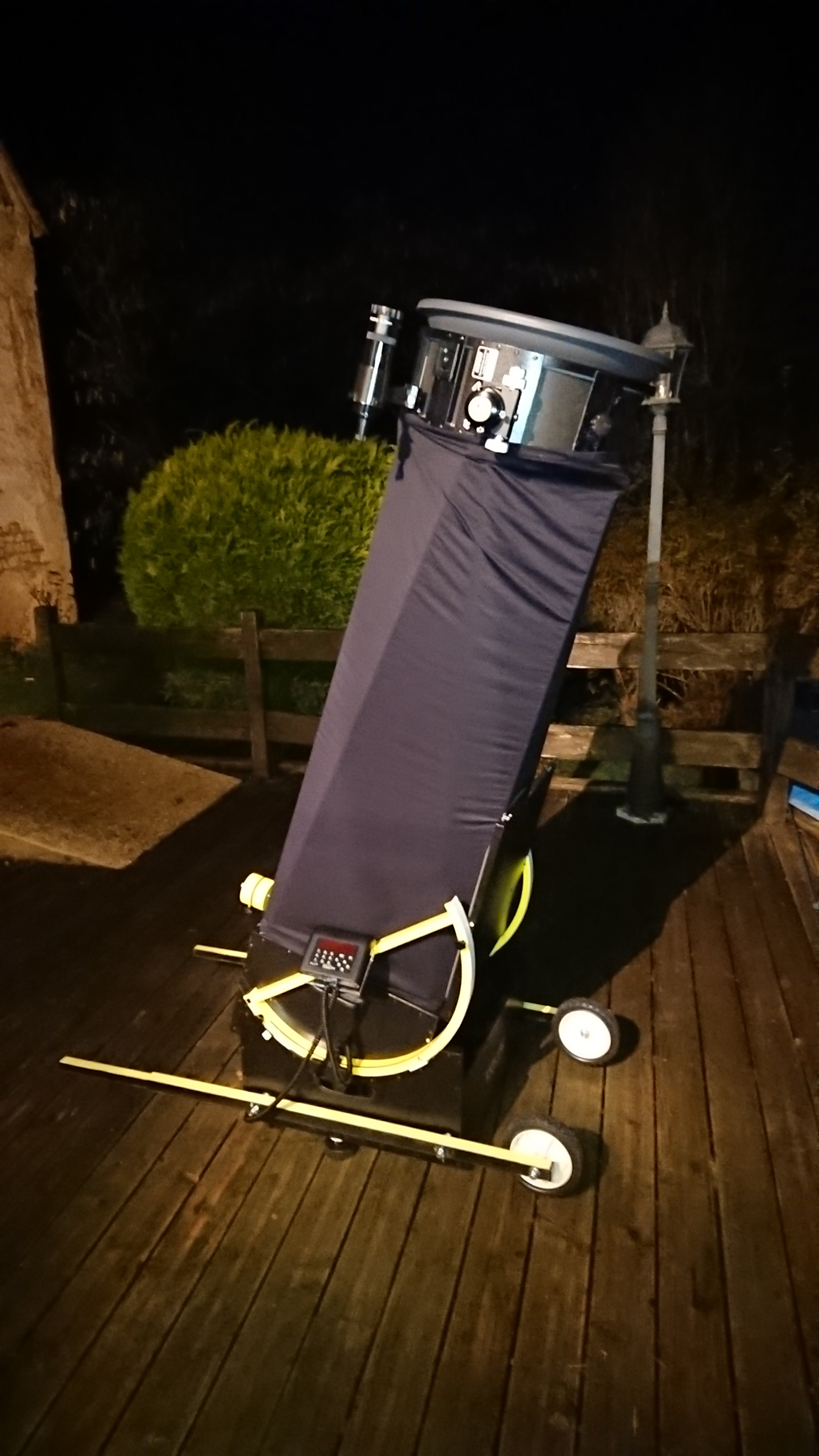 En fait, j'ai réalisé cette brouette pour transporter tout monter le dobson, comme cela se fait sur les dobson d'artisans. Ca me permet aussi de laisser installer le kit Nexus à demeure et la colimation ne bouge quasiment pas  (ou juste un poil de rectification).