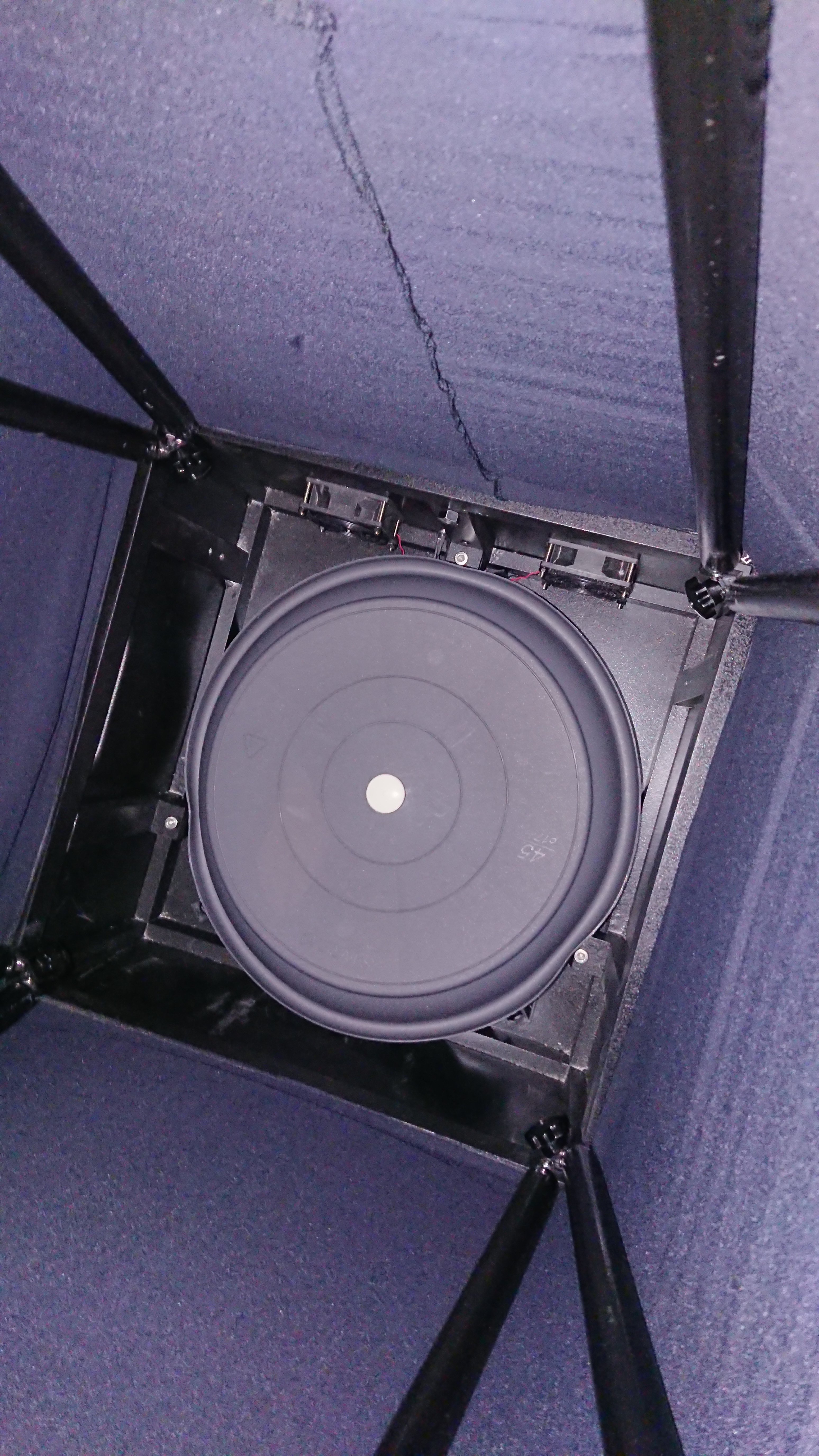 A la vue des nombreuses aspérités et imperfections de coupes de métaux ou de soudures sur la cage, je n'ai pas tenté de monter la jupe jusque et sur la cage, de peur de la déchirer. J'ai fait un baflage dans la cage avec un tapis décathlon et j'accroche la jupe sur les 4 têtes de boulon de fixation de la cage.