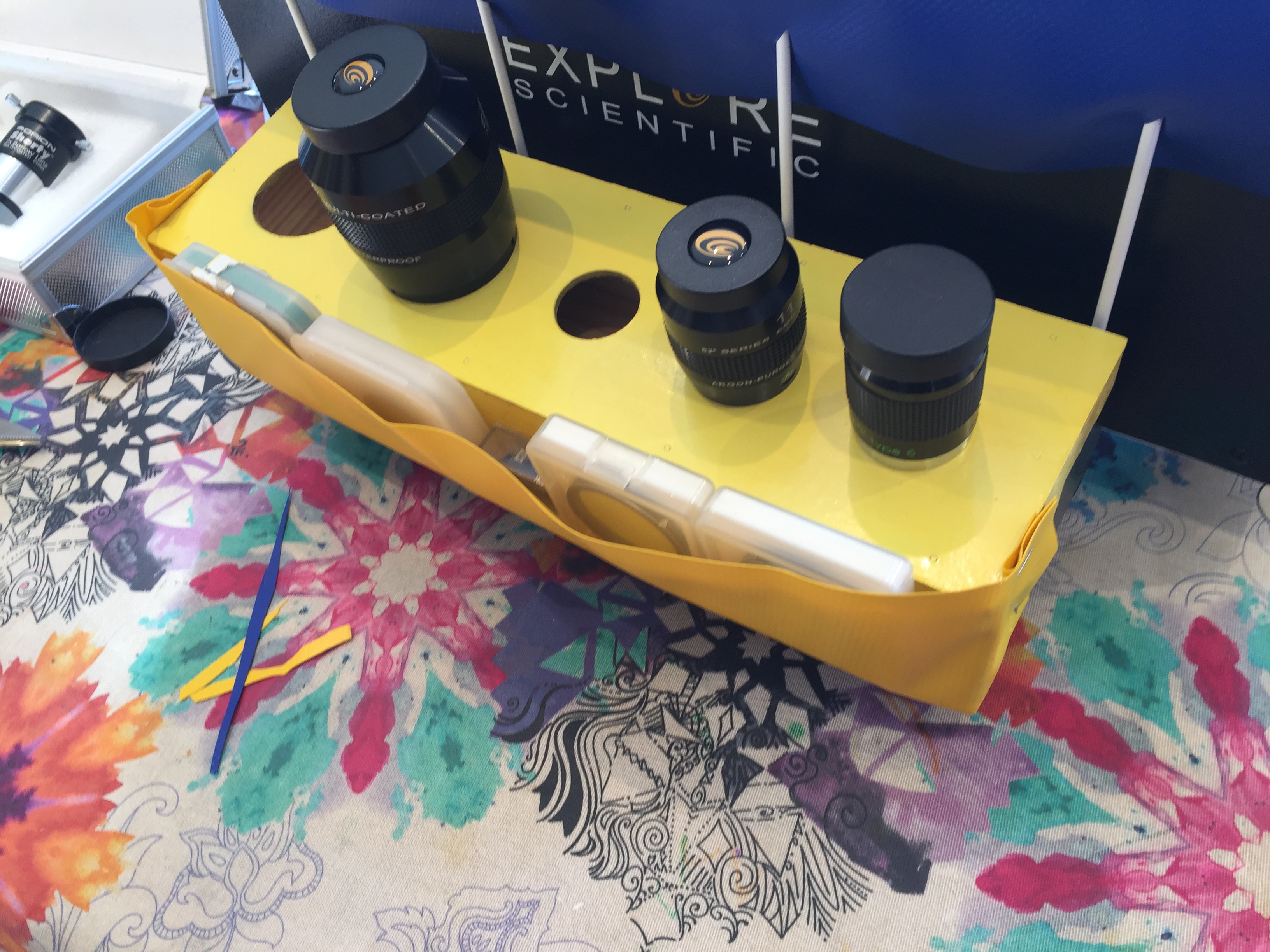 il m’avait confectionné une boîte à oculaire sur mesure, en bois, que j’avais ensuite peint en jaune pour rappeler la couleur des haches du télescope. Je l’avais testé au sol, elle est top!