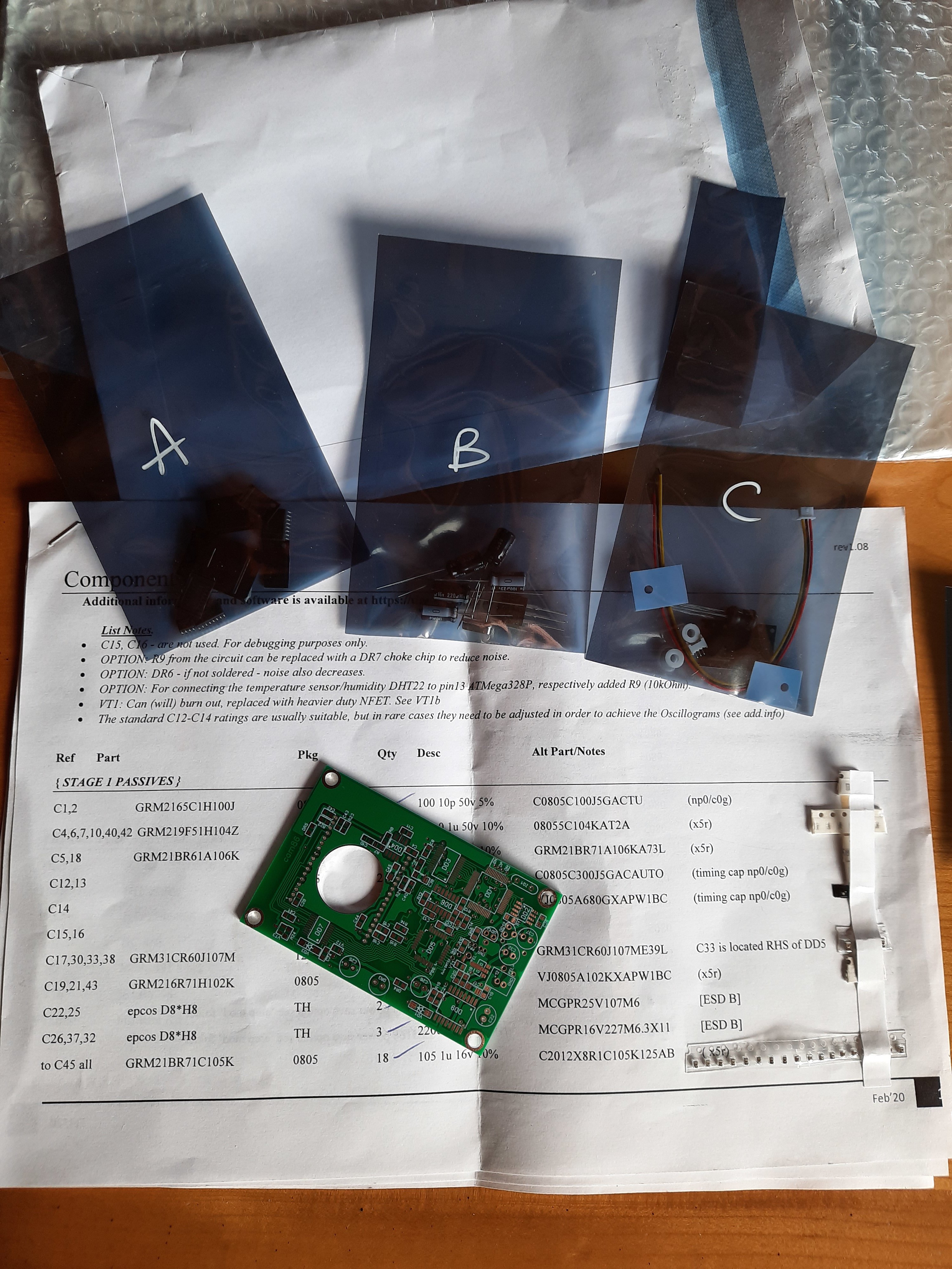 Comme j'entrevoyais une galère avec la liste des composants et que je suis très très léger en électronique, j'ai préféré suivre un lien publié sur le forum et acheté un kit Anglais sur Ebay avec le pcb et tous les composants pour 80,74 € ; lui aussi en attente de livraison. J'ai échangé un peu avec le vendeur. Il a l'air sérieux...