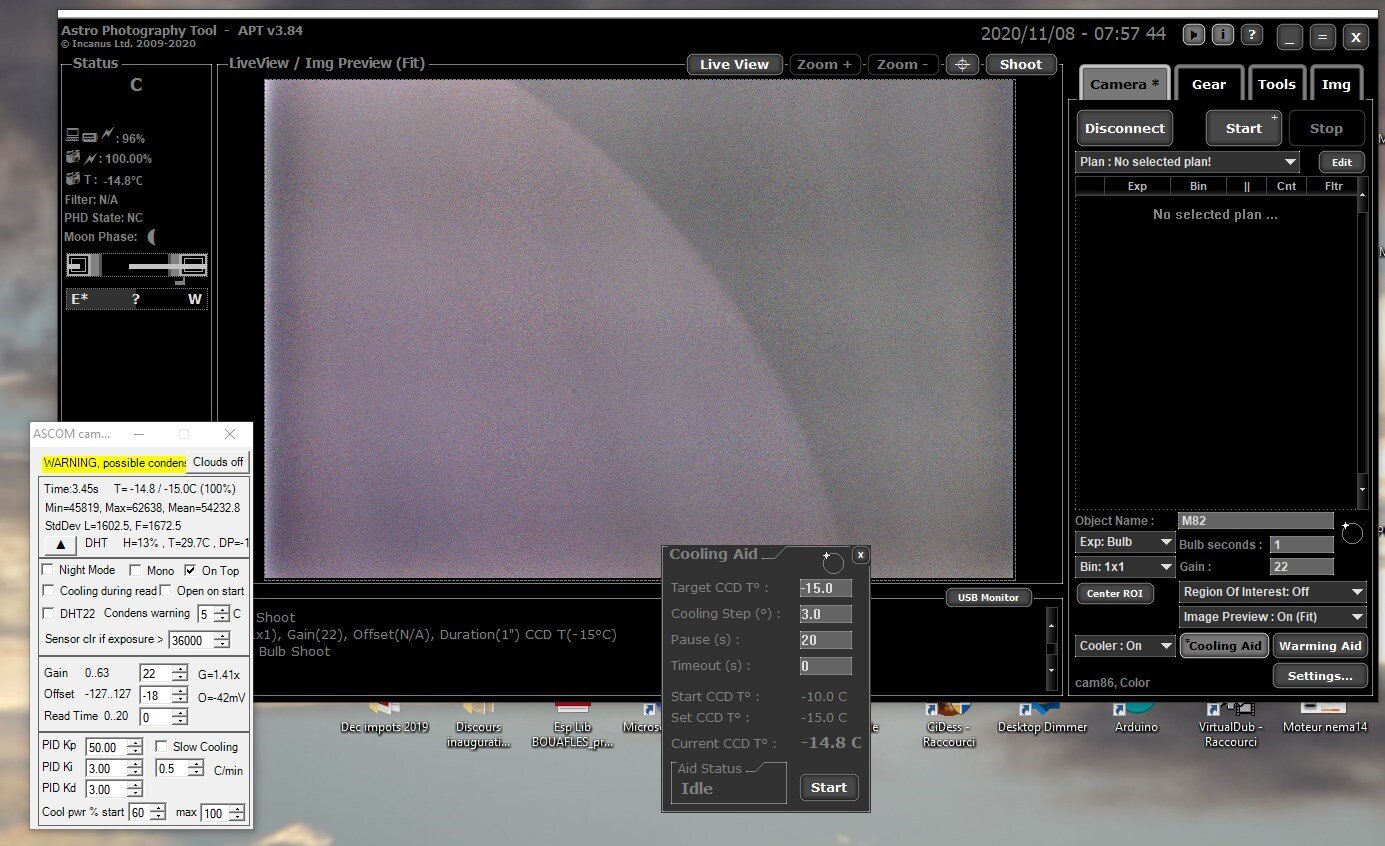 Je joins une saisie d'écran d'un test sous APT: capteur refroidi pendant une demi-heure à -15° avec une température dans le boitier de 29,7 ° soit un delta de presque 45° sans une trace de condensation sur le capteur ni sur le filtre ! Impec !