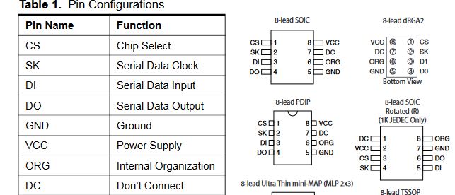 J'ai un doute sur mon EEPROM, comme je n'en trouvais nul part, je l'ai pris sur ALI. Lorsque je lis ce qu'il y a sur l'eeprom, il me sort que des "FF" en hexadecimal, dans tous les secteurs de mémoire. EN regardant le datasheet, j'ai pu voir que pour le format SOIC (voir schéma ci dessous), il existe deux composants ayant des brochages différents. J'ai demandé au vendeur le schéma des pins du composant, sans réponse.
