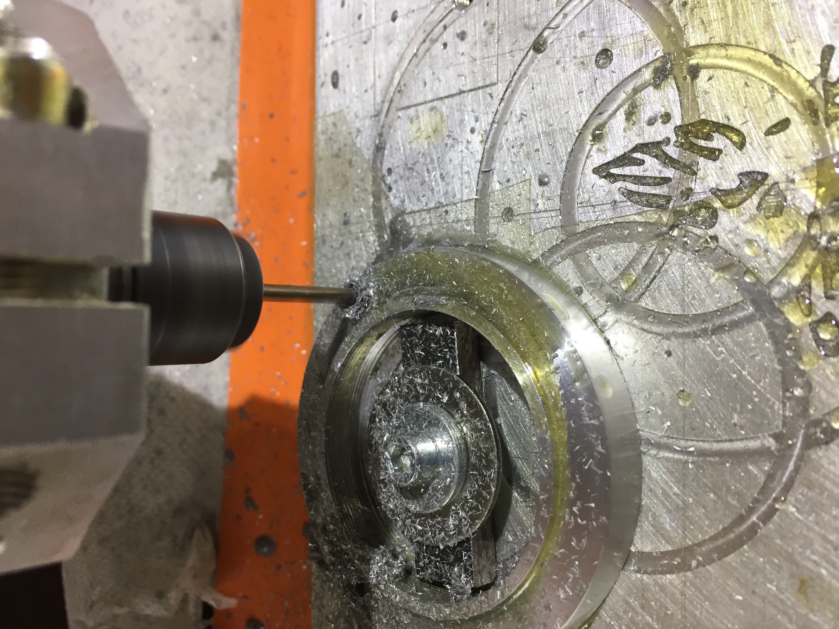 La bague de Tilt en cours d'usinage a la fraise de 3mm. la photo nécéssite une rotation de 90°... La broche est verticale..)
