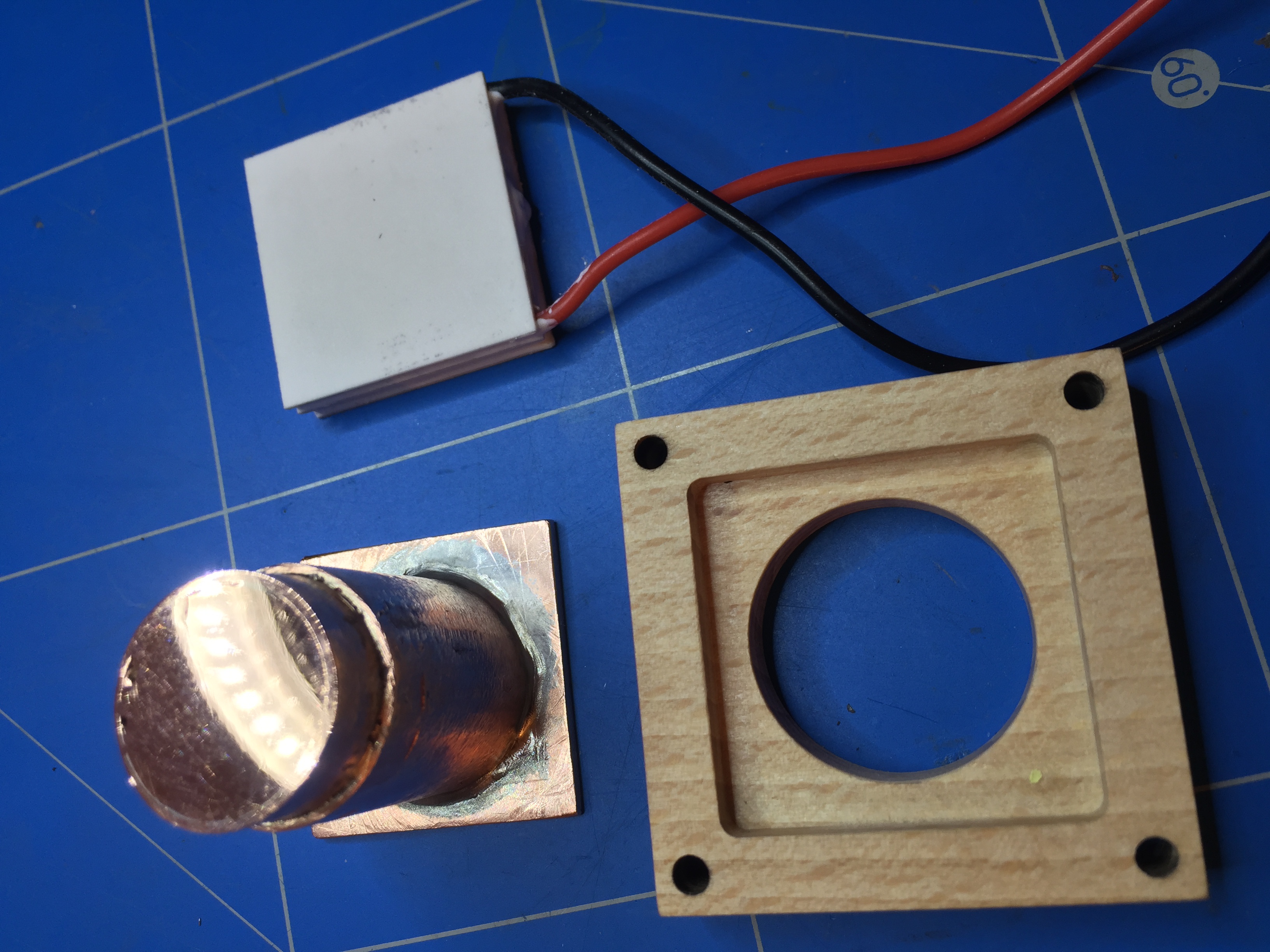 enfin, j'ai usiné le couvercle pour permettre au peletier d'être en contact avec le radiateur. Les vis de fixation de la bague en bois permettent de comprimer le peletier et le doigt froid contre le radiateur.