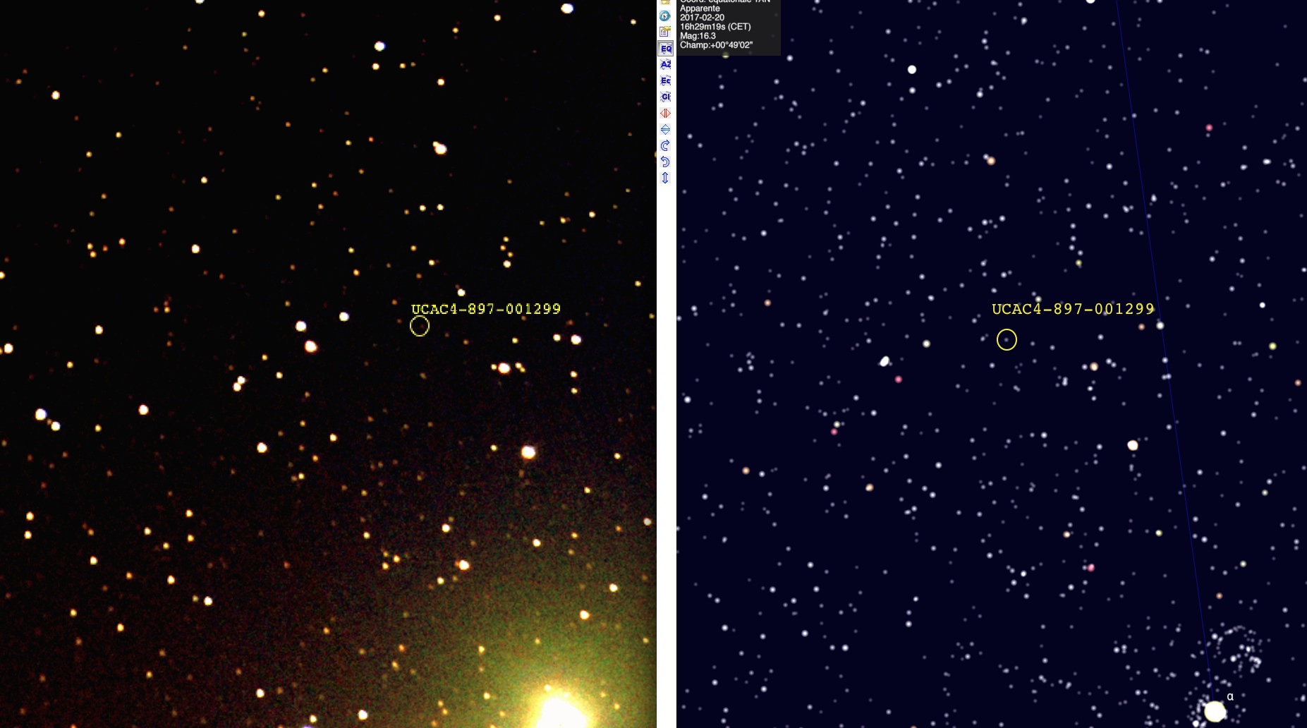 Cela m'a permis de déterminer que on pouvait observer sans probleme jusqu'a une Magnitude de 14 et que le plus fin détail observable était UCAC4-897-001299 magnitude 15