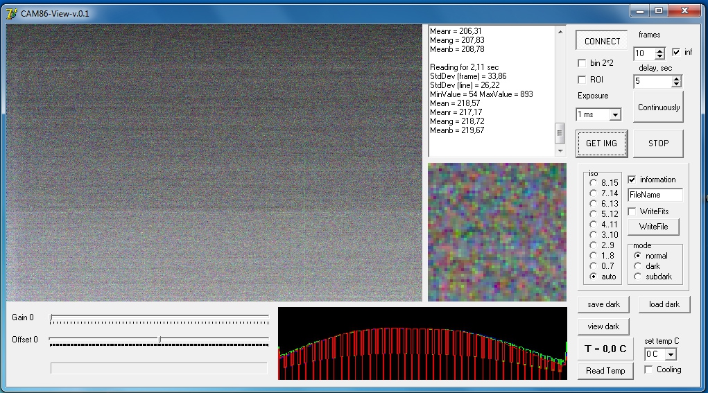 Mesure des StdDev à 0ms avec CamView, objectif bien occulté pour avoir un bon Dark.