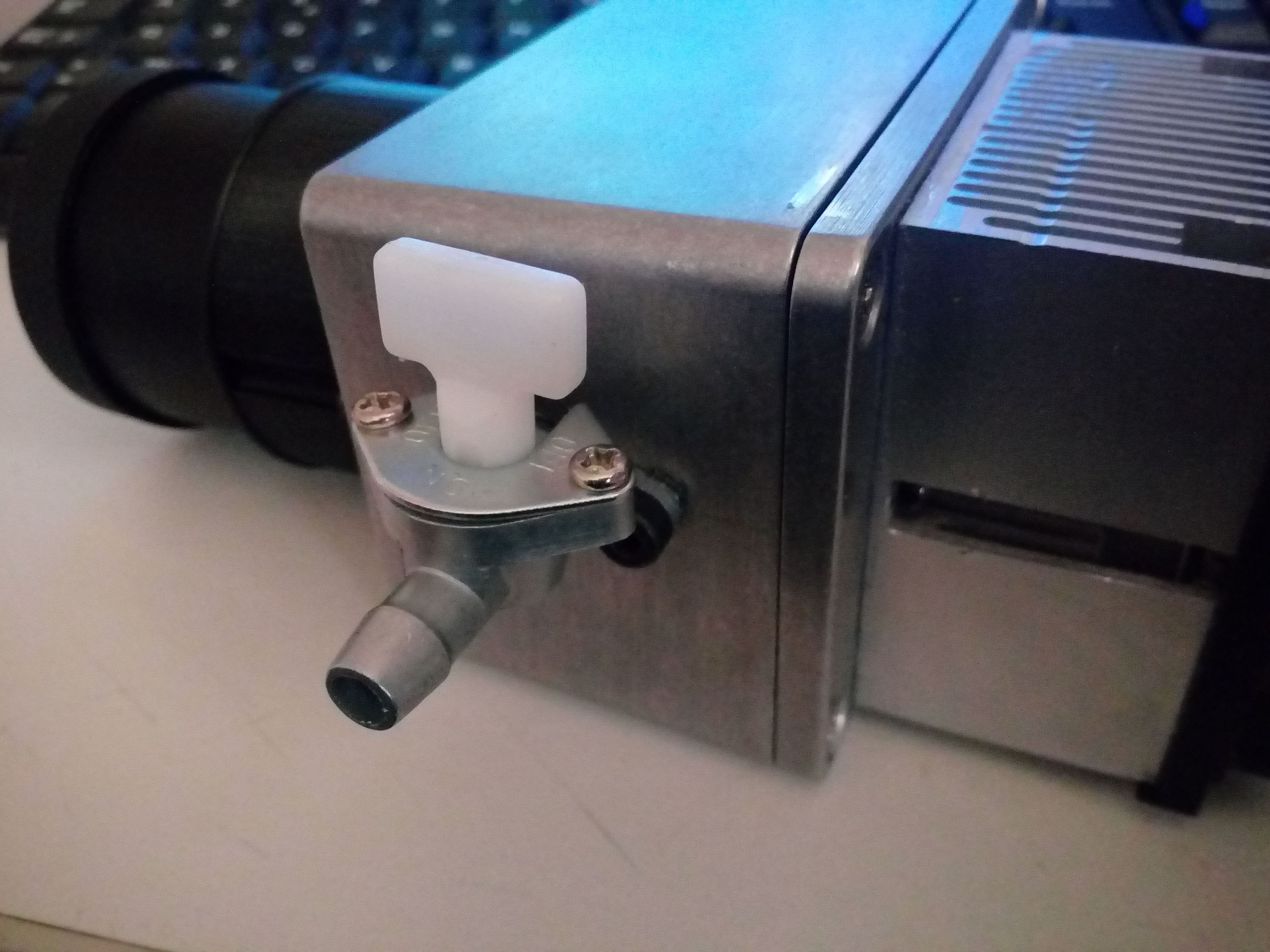 J'ai modifié ma cam, maintenant elle tourne au SP95 :D. C'est un petit robinet d'essence de pocket bike. C'est pas ce qu'il y a de plus esthétique mais ça fait le job. Pour tirer au vide j'ai utilisé une seringue de 60cc, du tuyau de bulleur d'aquarium, un té pour le manomètre et une pince a clamper. Je pensais que ça serai plus fastidieux que ça avec une seringue mais en fait ça va bien. J'ai fait une petite vidéo.