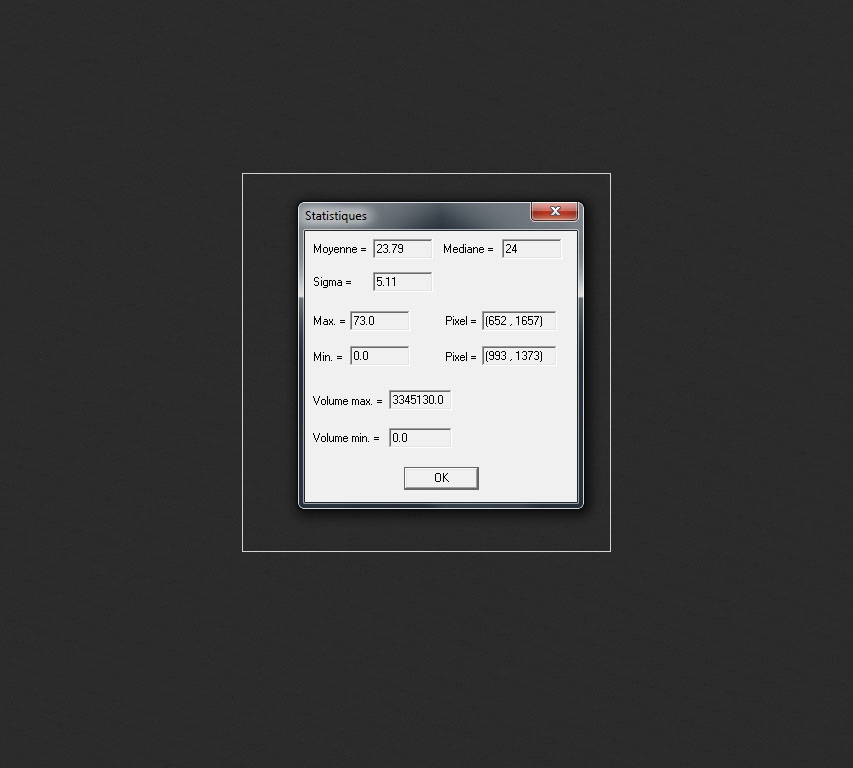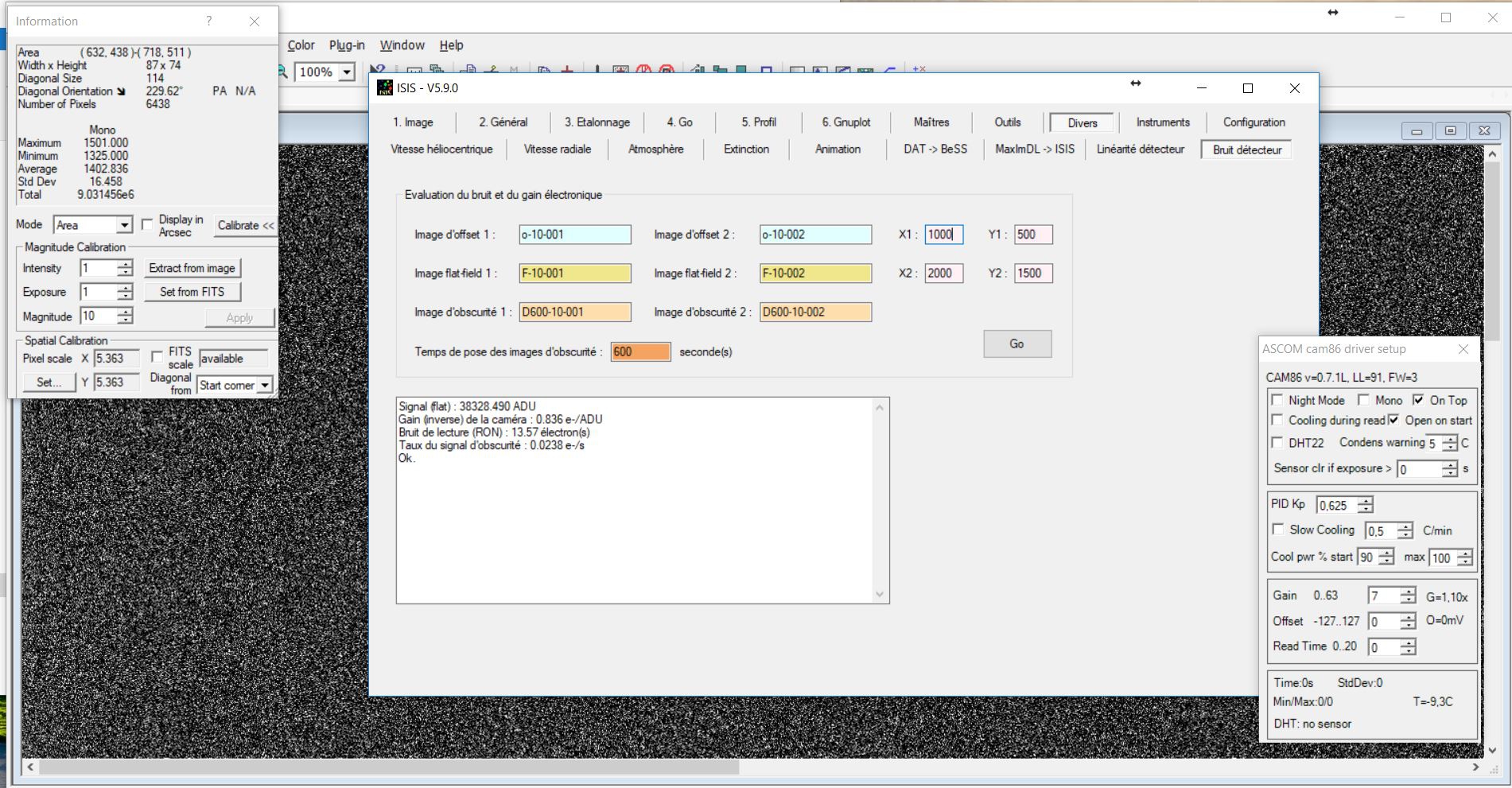 Donc, j'ai utilisé l'excellent logiciel ISIS de Christian Buil qui permet de calculer ces informations a partir de 2 flats, 2 offsets et 2 darks.