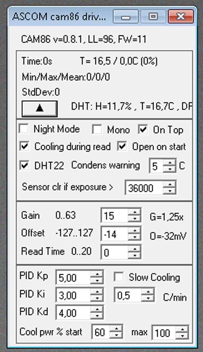 -On first camera connection in APT the cooling is on but the driver say 0%. It is not possible to turn off the cooling with APT. I must choice "on" in scroll menu, at this moment the driver turn on the cooling and only at this moment i can switch off the cooling with APT.