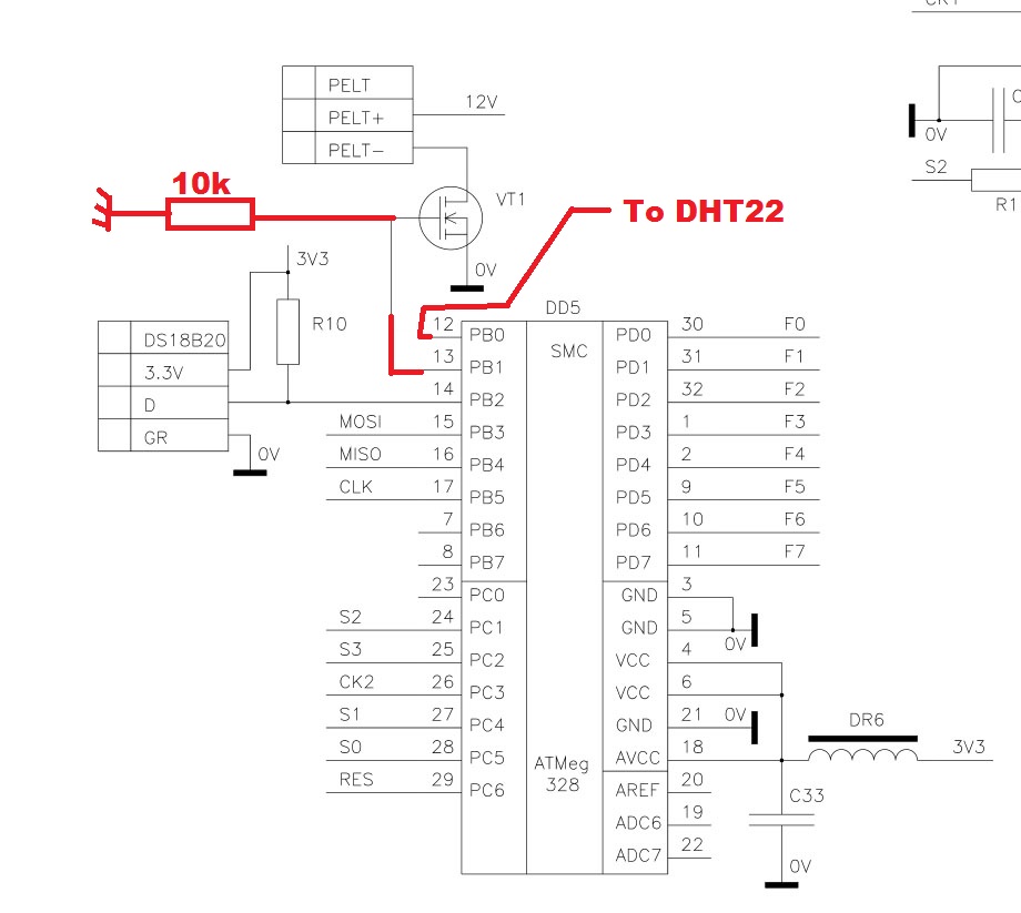 1. I disconnected the TEC pin PB0 and "moved" the humidity pin PB1 to the TEC control. This required moving two resistors and and some extra wires but I did not need to cut any traces on the PCB. Note that our IIS PCB is slightly different than the original Ukrainian one.