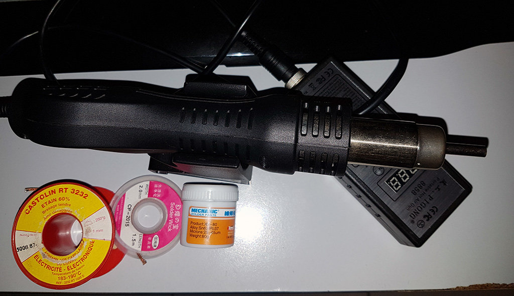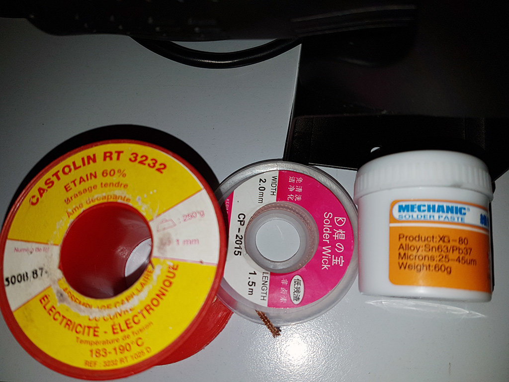 Ci-dessous le fer à air chaud et l'étain, pâte à souder et la tresse (suis pas trop fan de la pompe puis de plus, on risque d'aspirer un CMS :D).