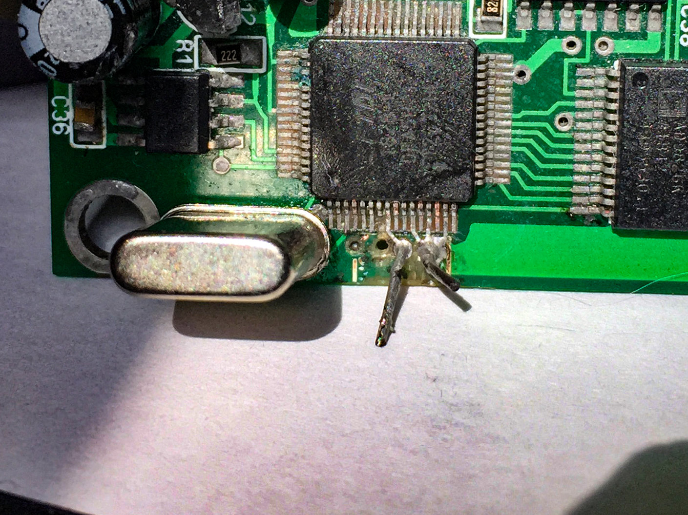 refait une photo de l'état en gros plan et bien nettoyé pour voir à quoi ça ressemble, il n'y a que 2 fils à souder (ou reste de tiges de condensateurs), ils peuvent être pris directement sur les Pins du FT à condition de les fixer après pour pas tirer dessus.