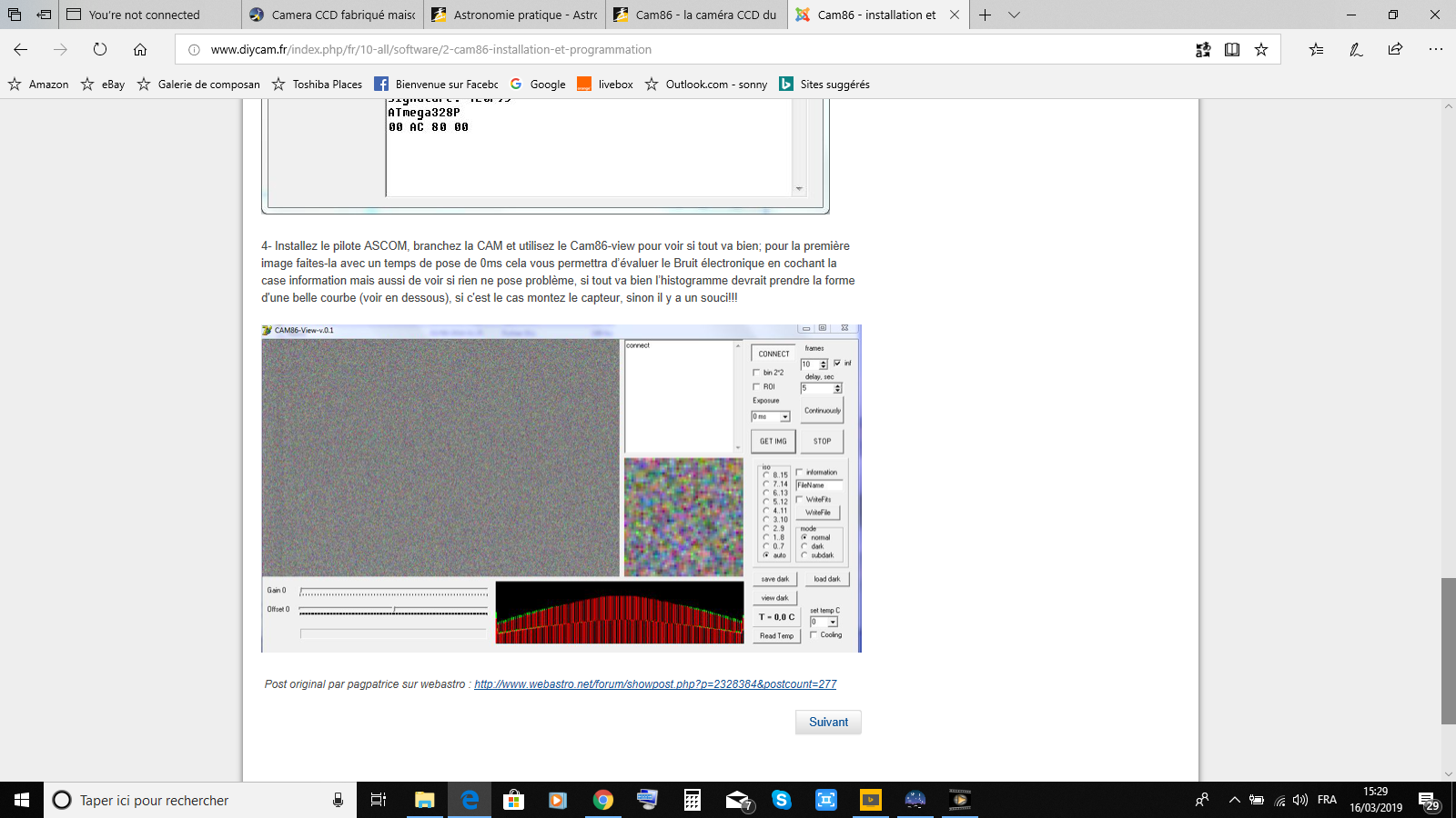 Installez le pilote ASCOM, branchez la CAM et utilisez le Cam86-view pour voir si tout va bien; pour la première image faites-la avec un temps de pose de 0ms cela vous permettra d’évaluer le Bruit électronique en cochant la case information mais aussi de voir si rien ne pose problème, si tout va bien l’histogramme devrait prendre la forme d'une belle courbe (voir en dessous), si c'est le cas montez le capteur, sinon il y a un souci!!!