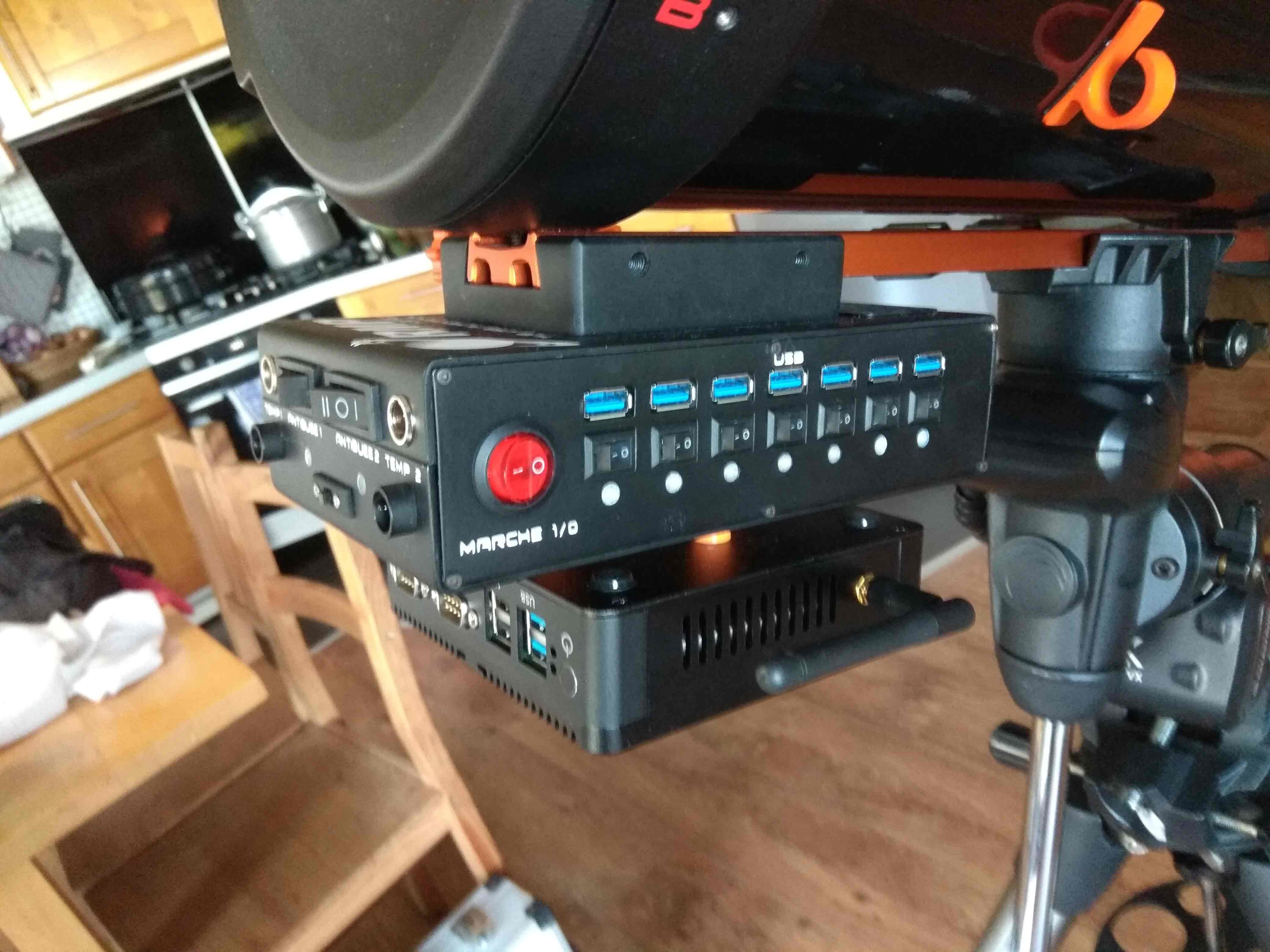 Un "super HUB " comportant toute l'alimentaion 12V, 5v, 3.7V et 7.4V ainsi que l'USB 3, un module anti buée automatique....et un PC Wifi et Bluetooth... en PLA