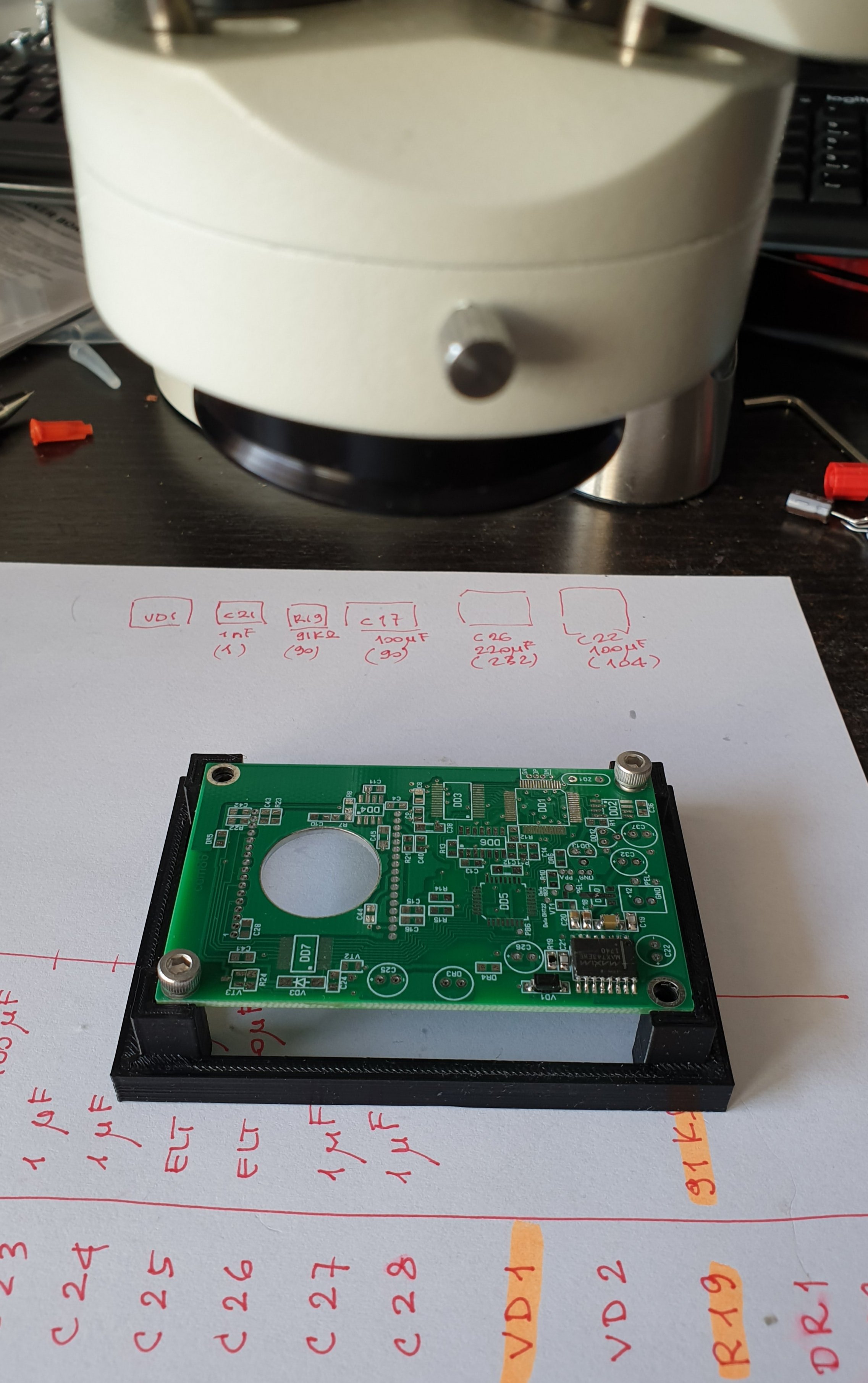 Bon j'ai recommencé avec le CI ukrainien ... il faut jamais se décourager :D j'en profite pour partager un truc que j'ai imprimé pour soutenir le CI pendant les opérations de soudage et test. Comme j'en suis satisfait, je pensais quelqu'un pourrait l'apprécier aussi. Le PCB se fixe avec écrous M4, si on veut, et on peut le retourner des deux côtés.