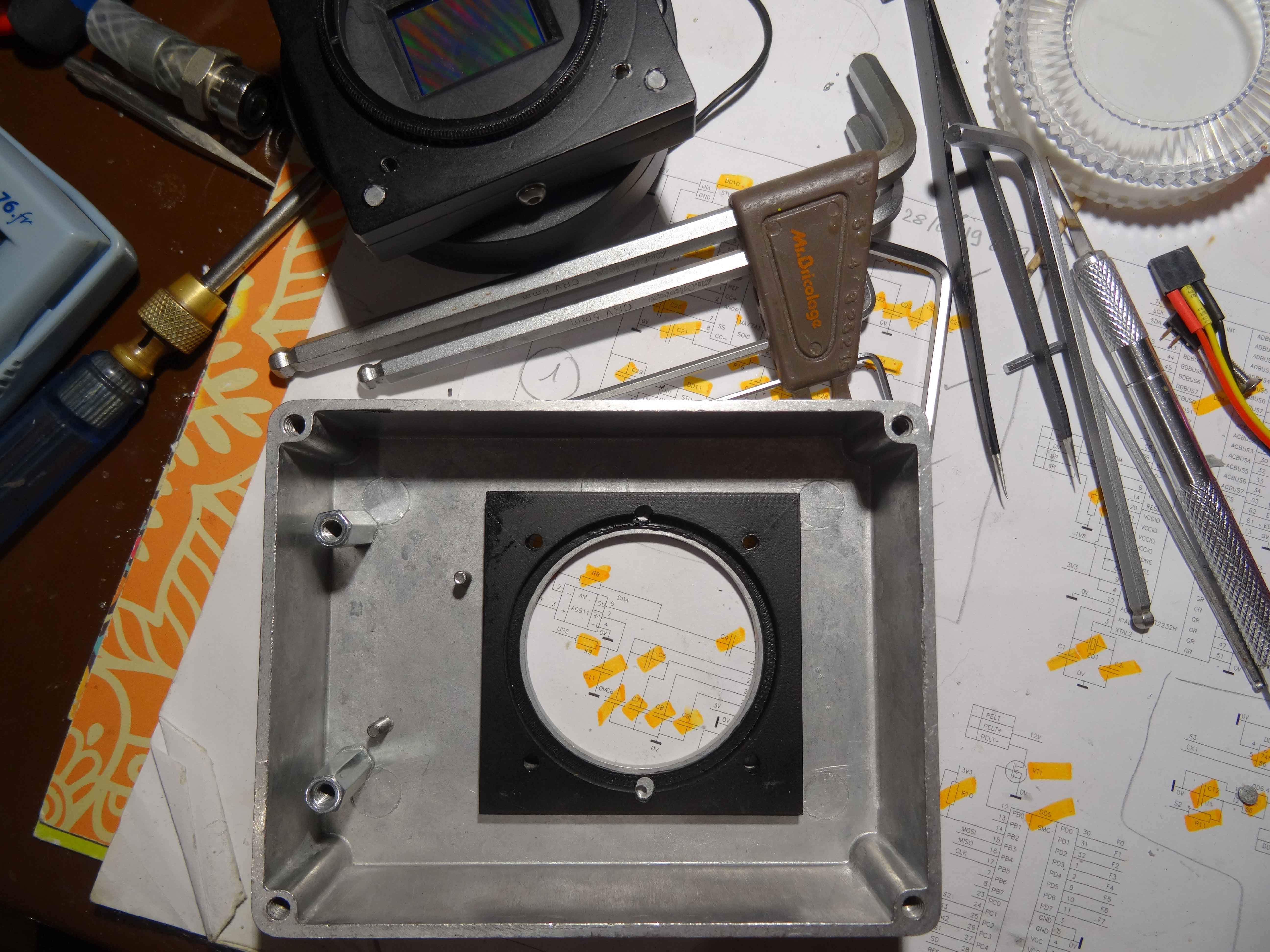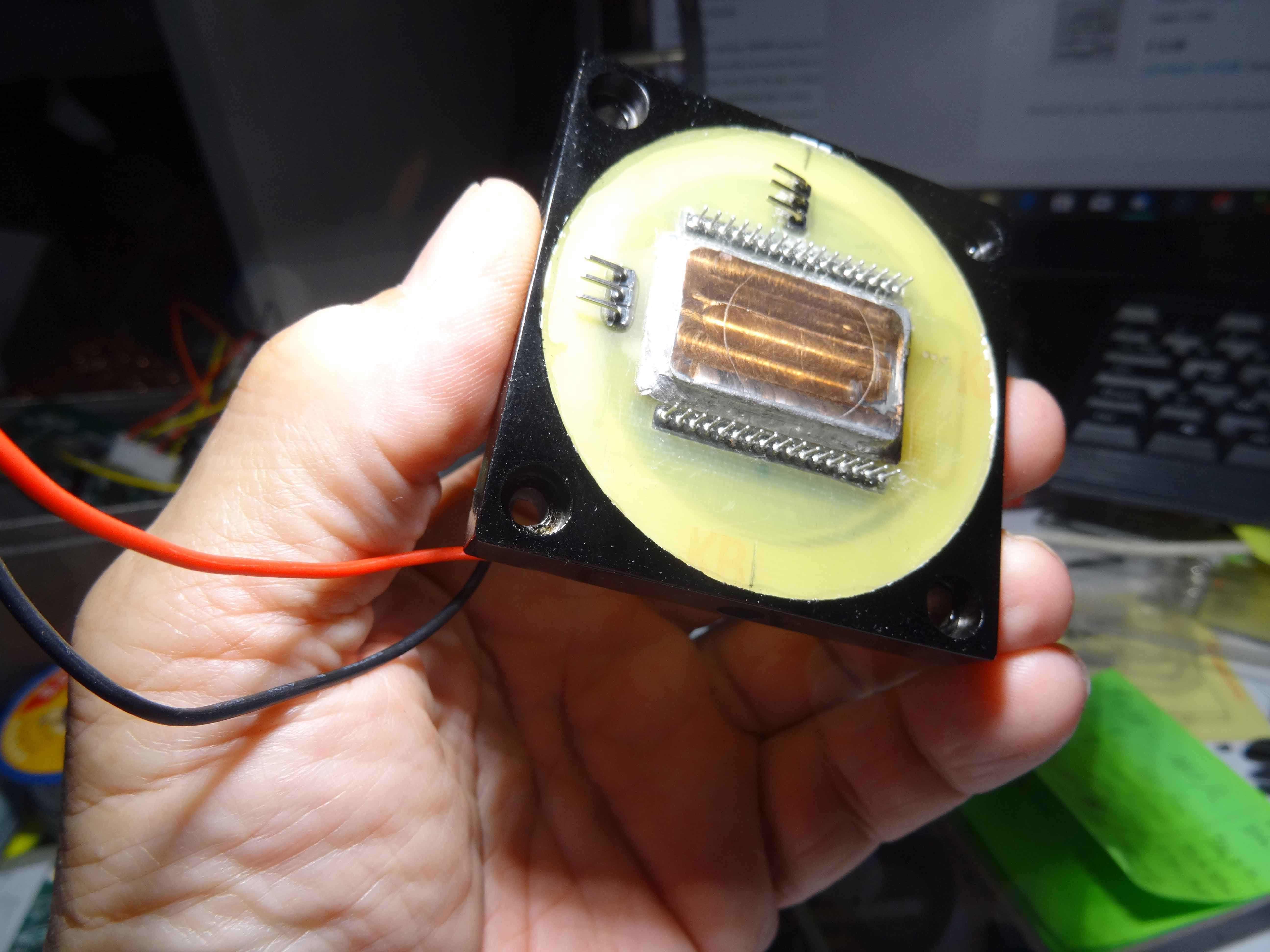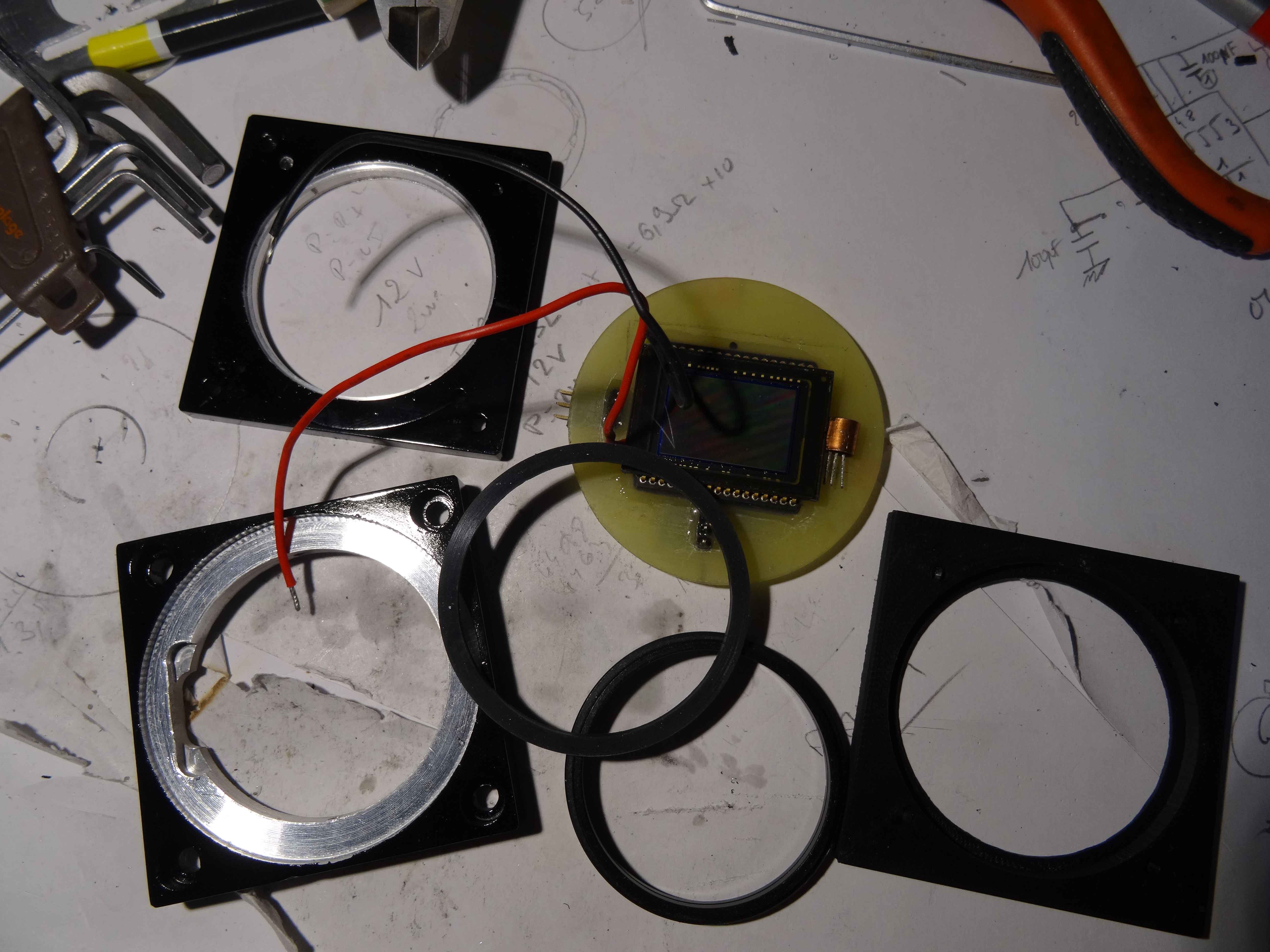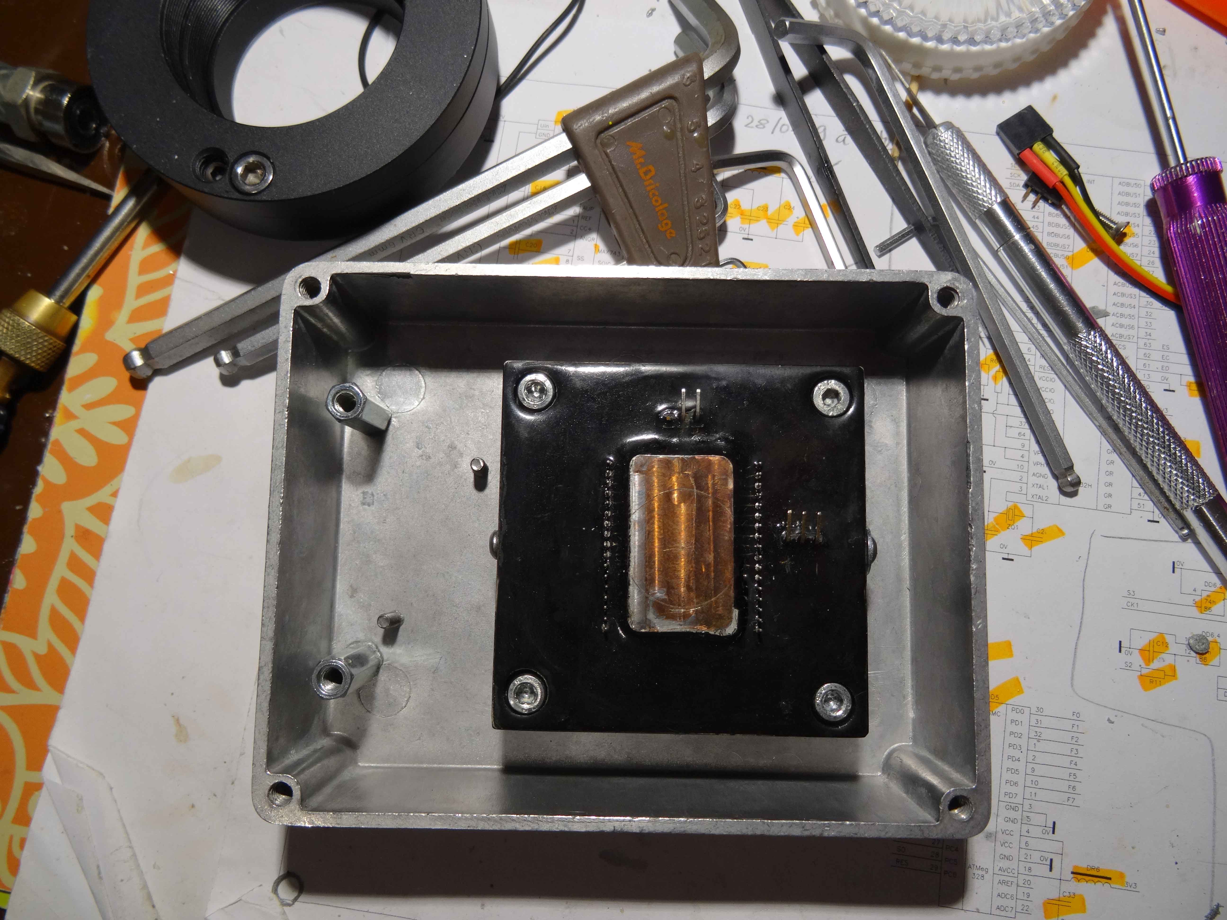 Voilà un peu dans le désordre , mon boitier capteur qui sera sous argon dés que ma pompe à vide refonctionnera (d'ici demain je pense)... Sur ce boitier viendra se connecter la carte et l'ensemble se retrouve dans le boitier lui même.....A suivre donc!!!