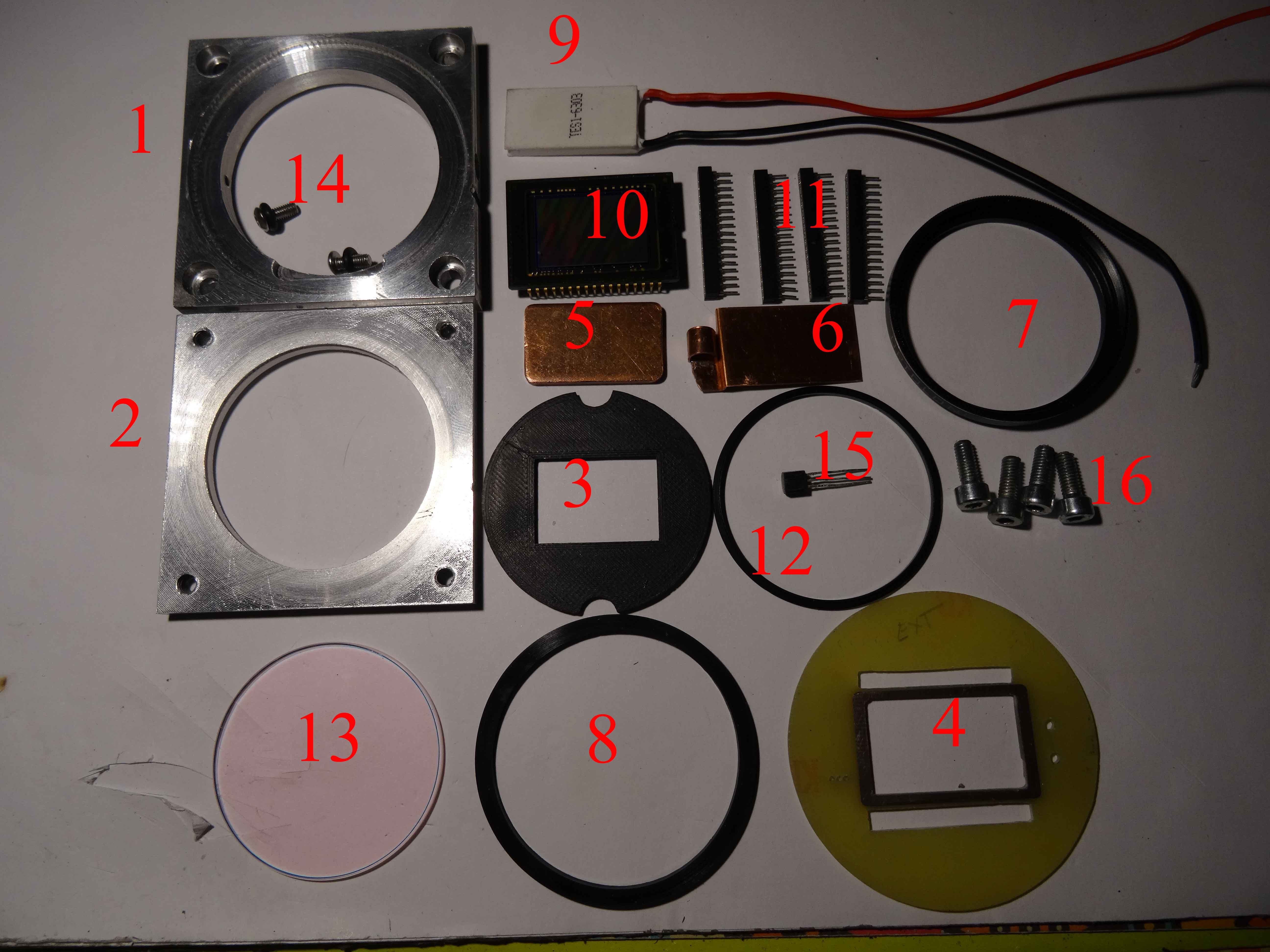 Mon KIT de base ; 1 partie arrière du boitier ; 2 partie avant ; 3 cache avant pour éviter les reflets parasites ; 4 le support capteur en époxy; 5 plaque de cuivre de 2,5 mm qui sera en contact avec le Peltier et le doigt; 6 plaque de cuivre de 0.5 mm en contact avec le Peltier et le capteur et qui porte le DS18B20; 7 bague du hublot M48; 8 joint d'étanchéité; 9 le Peltier ; 10 le capteur; 11 les supports du capteur; 12 la bague de serrage du filtre hublot; 13 le hoblot , un filtre IR/UV cut ;14 les vis bouchon pour le vide et l'argon; 15 le DS18B20 ; 16 les vis de fermeture....