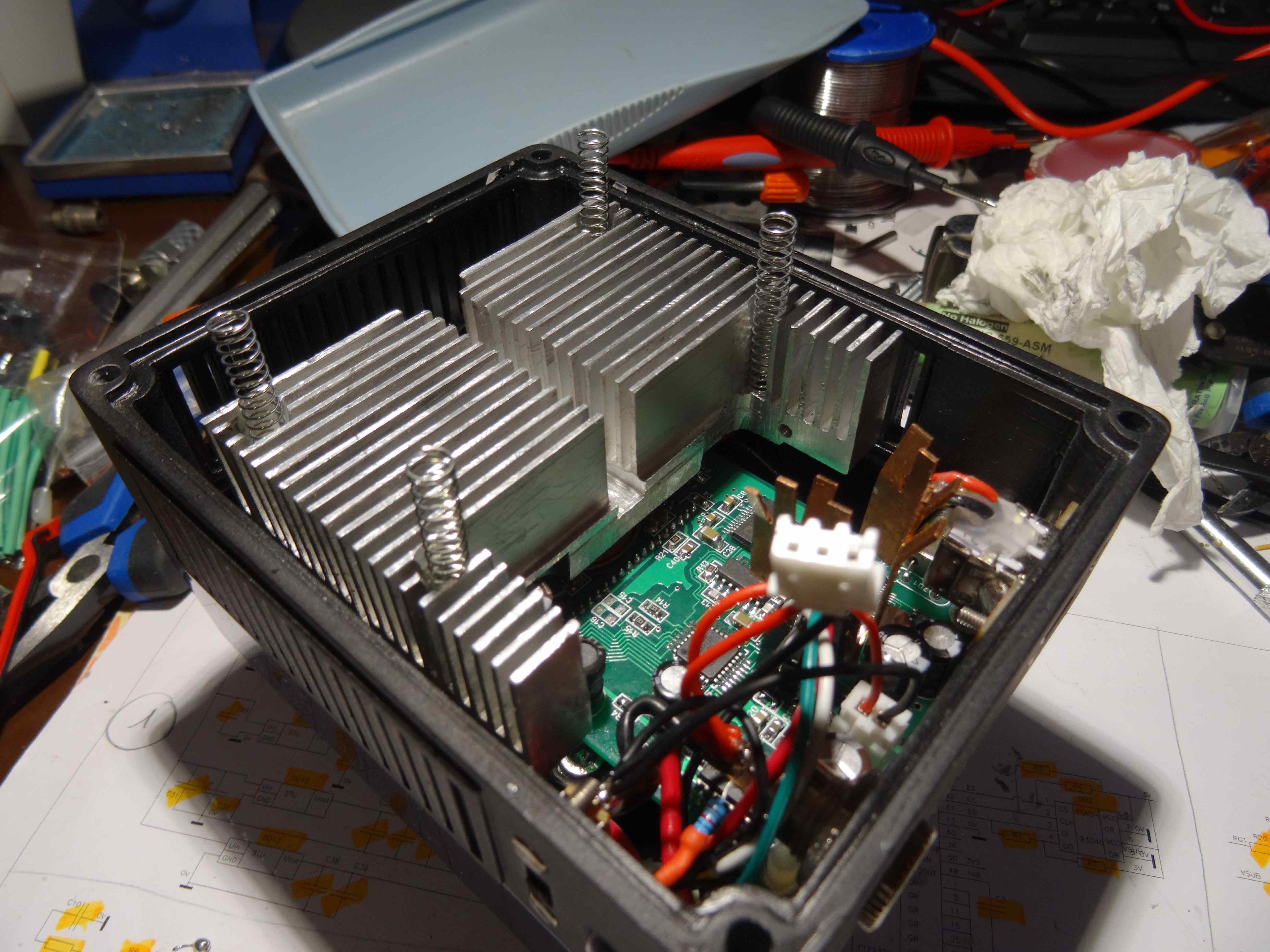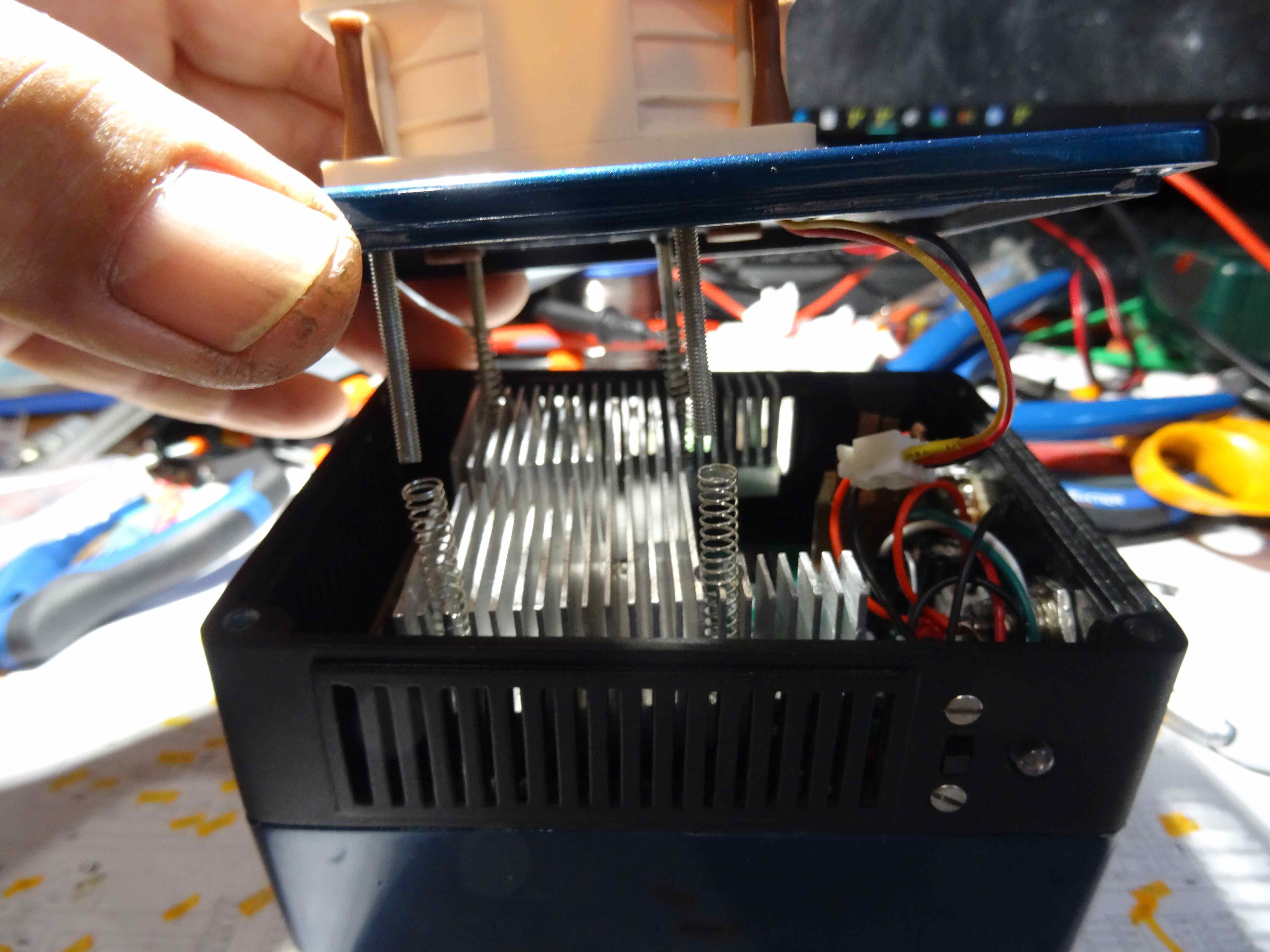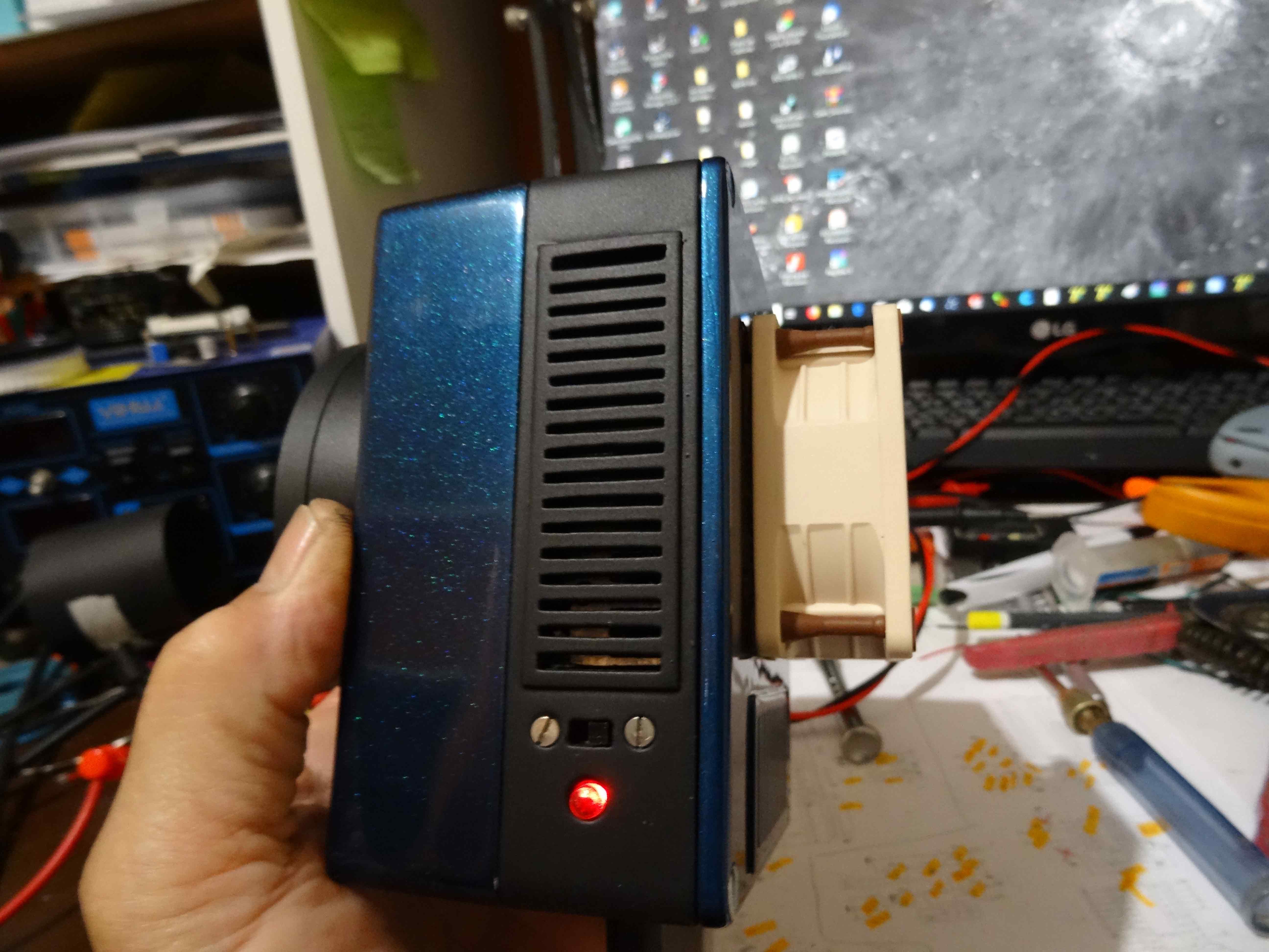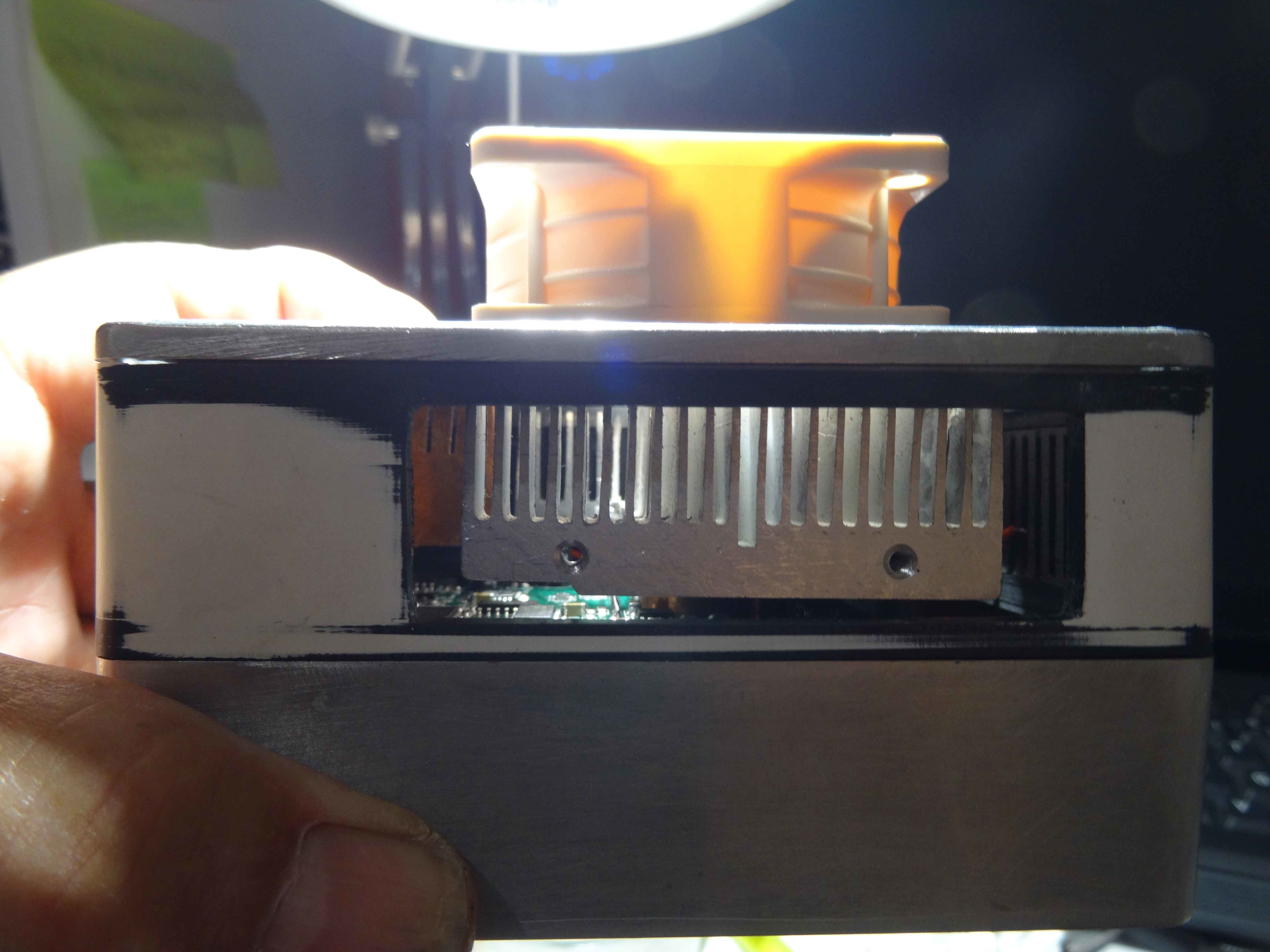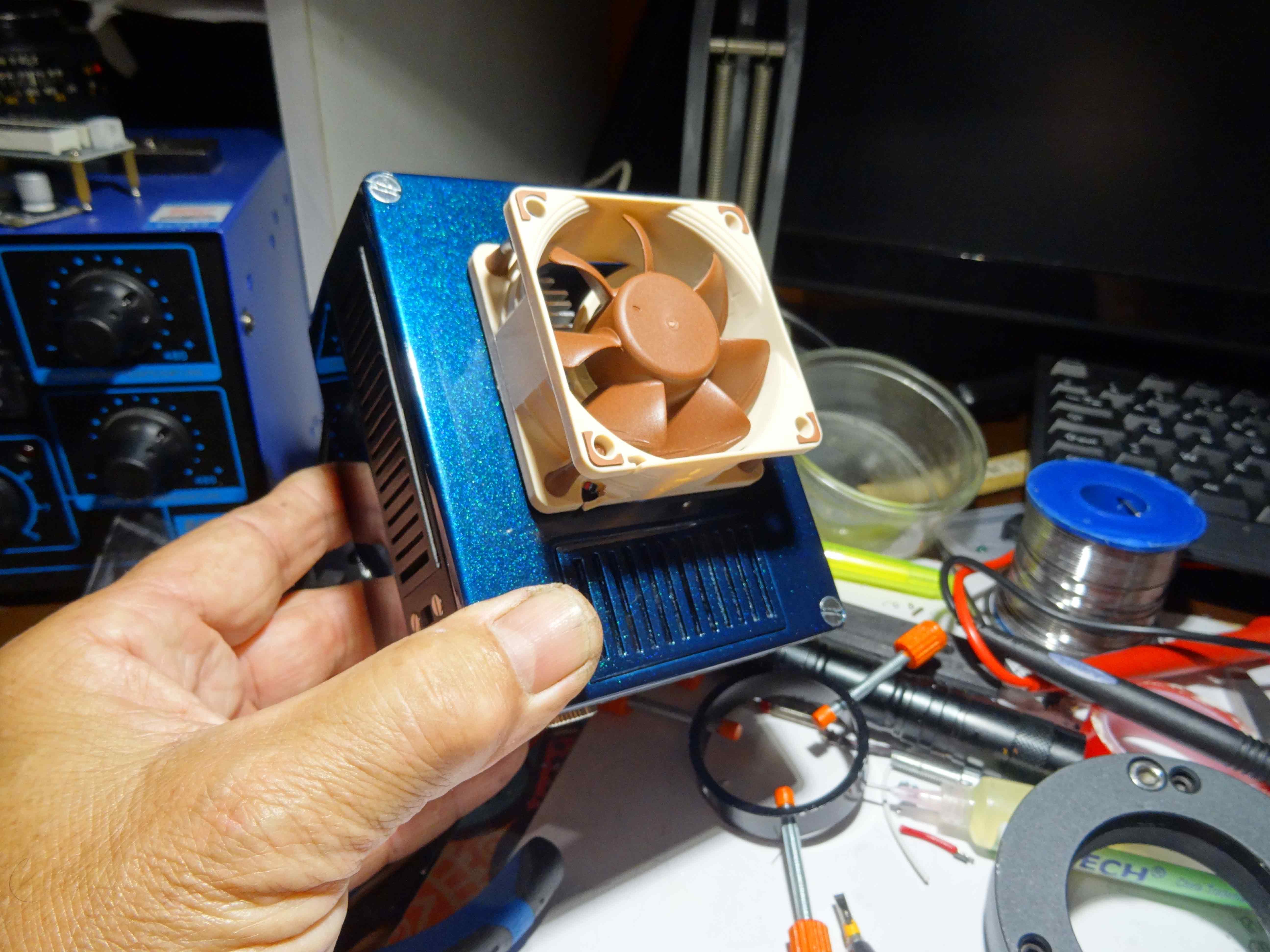Une autre avec une grille d'aération retirée...Le couvercle est placé au dessus et l'on voit bien les radiateurs en cuivre qui seront ainsi que la carte,  refroidis par le ventilo....