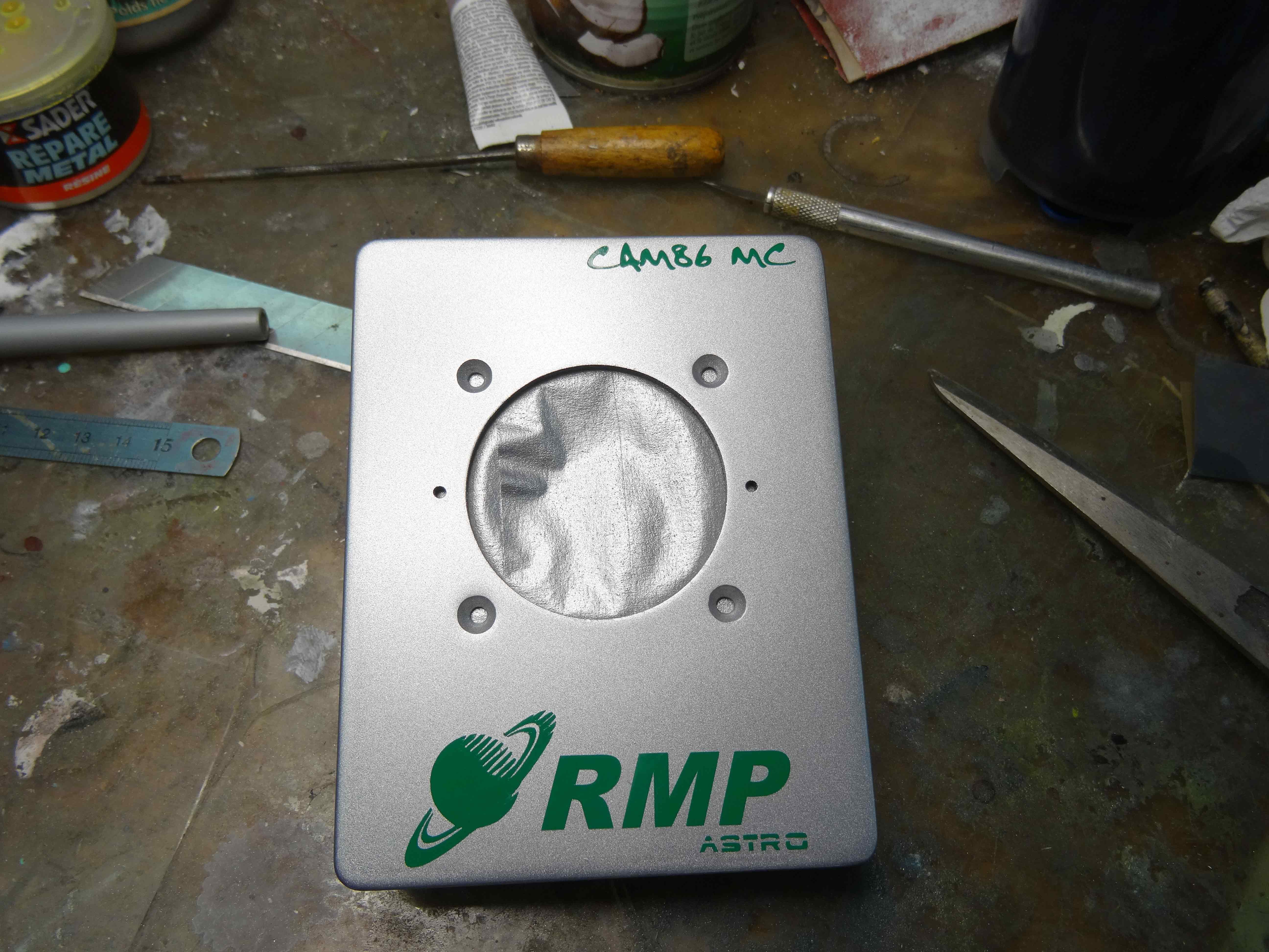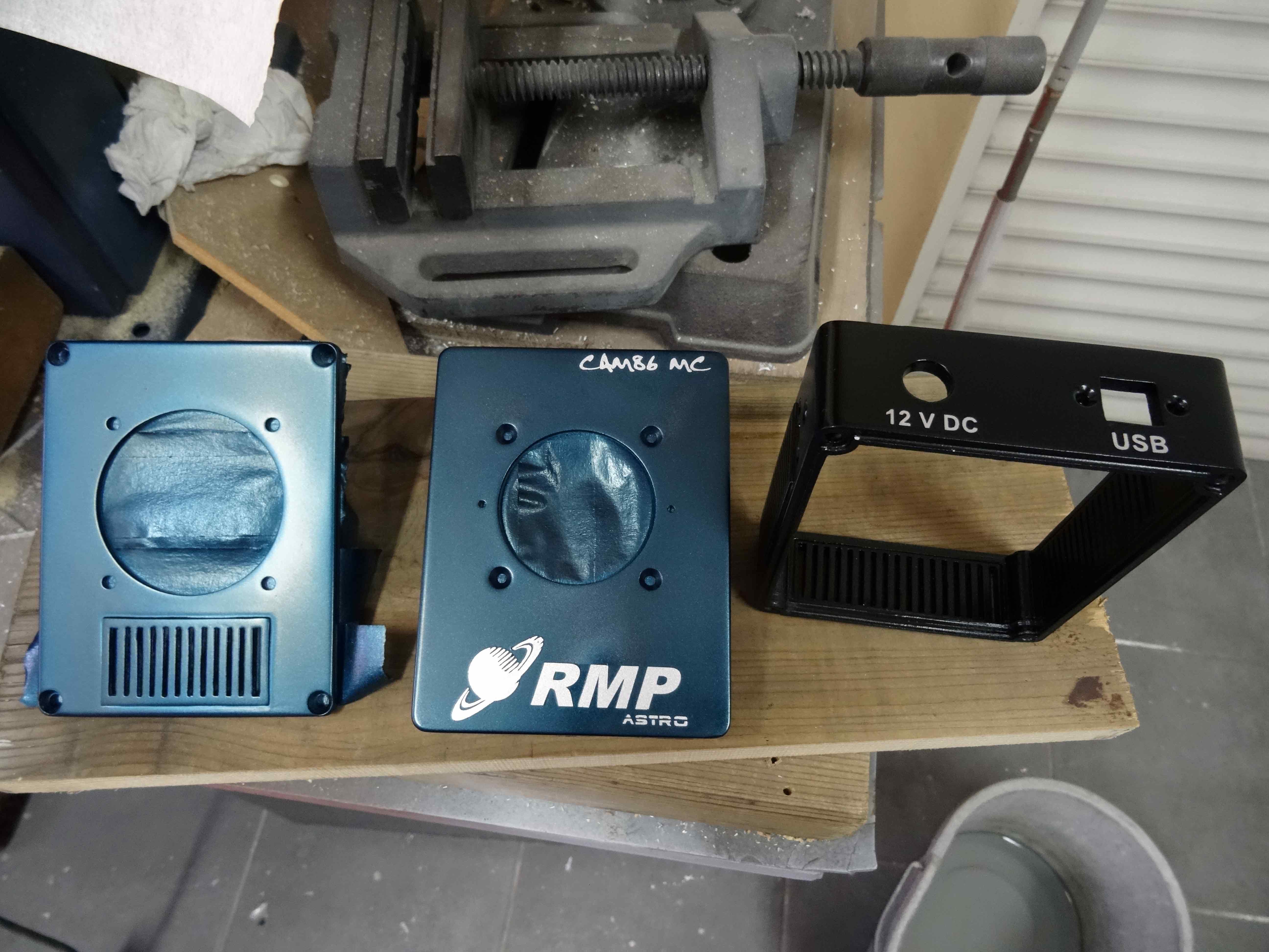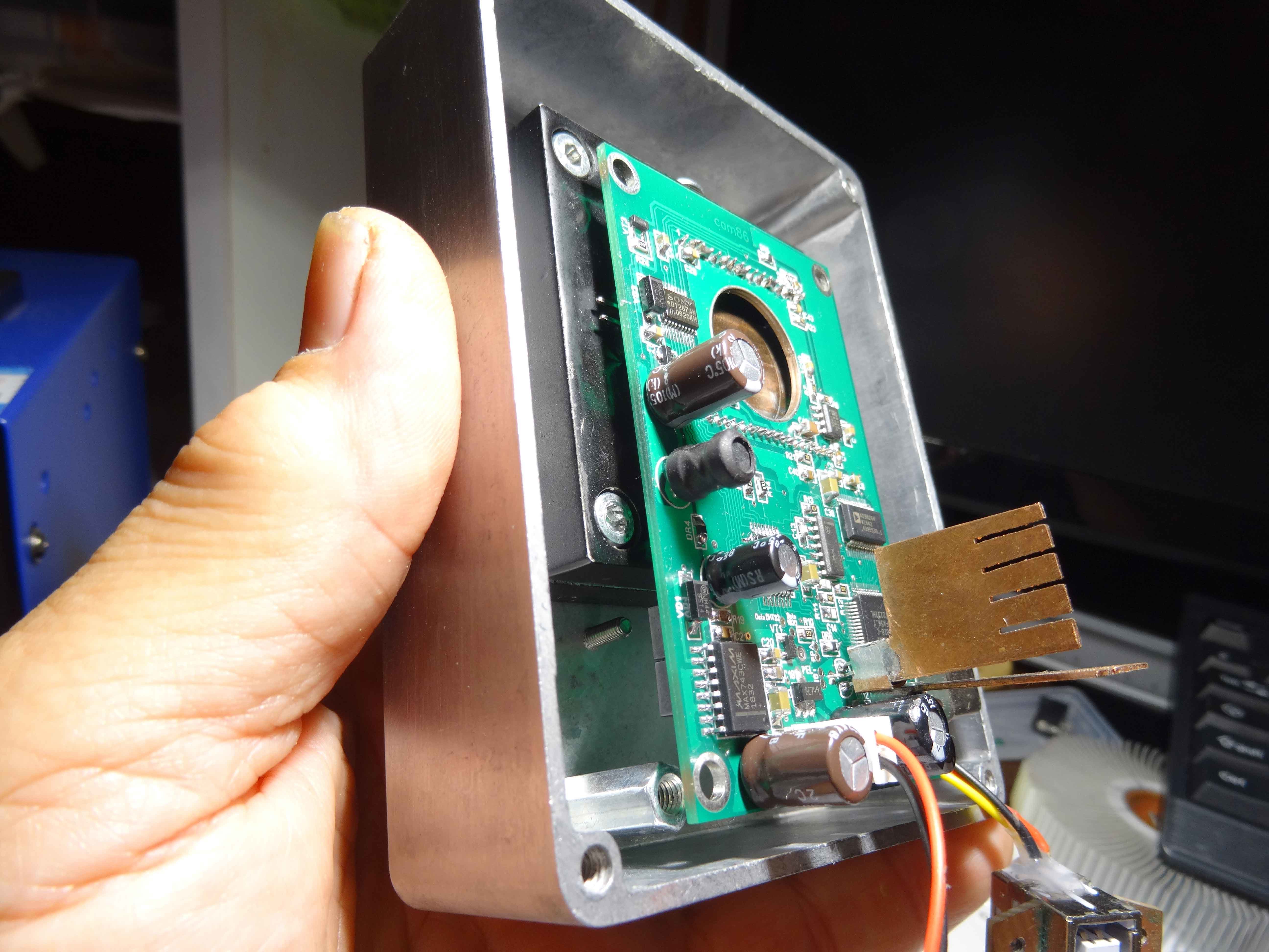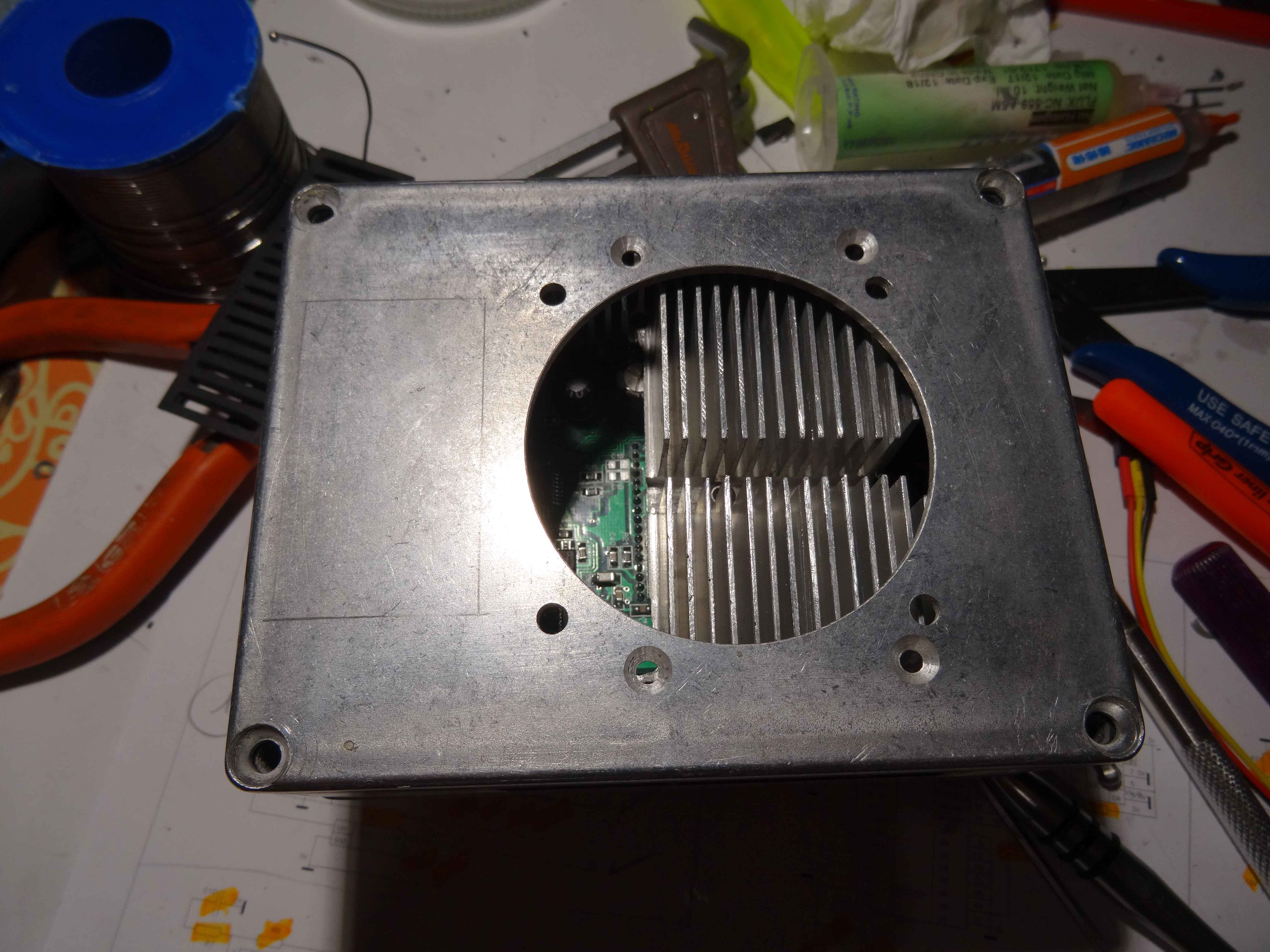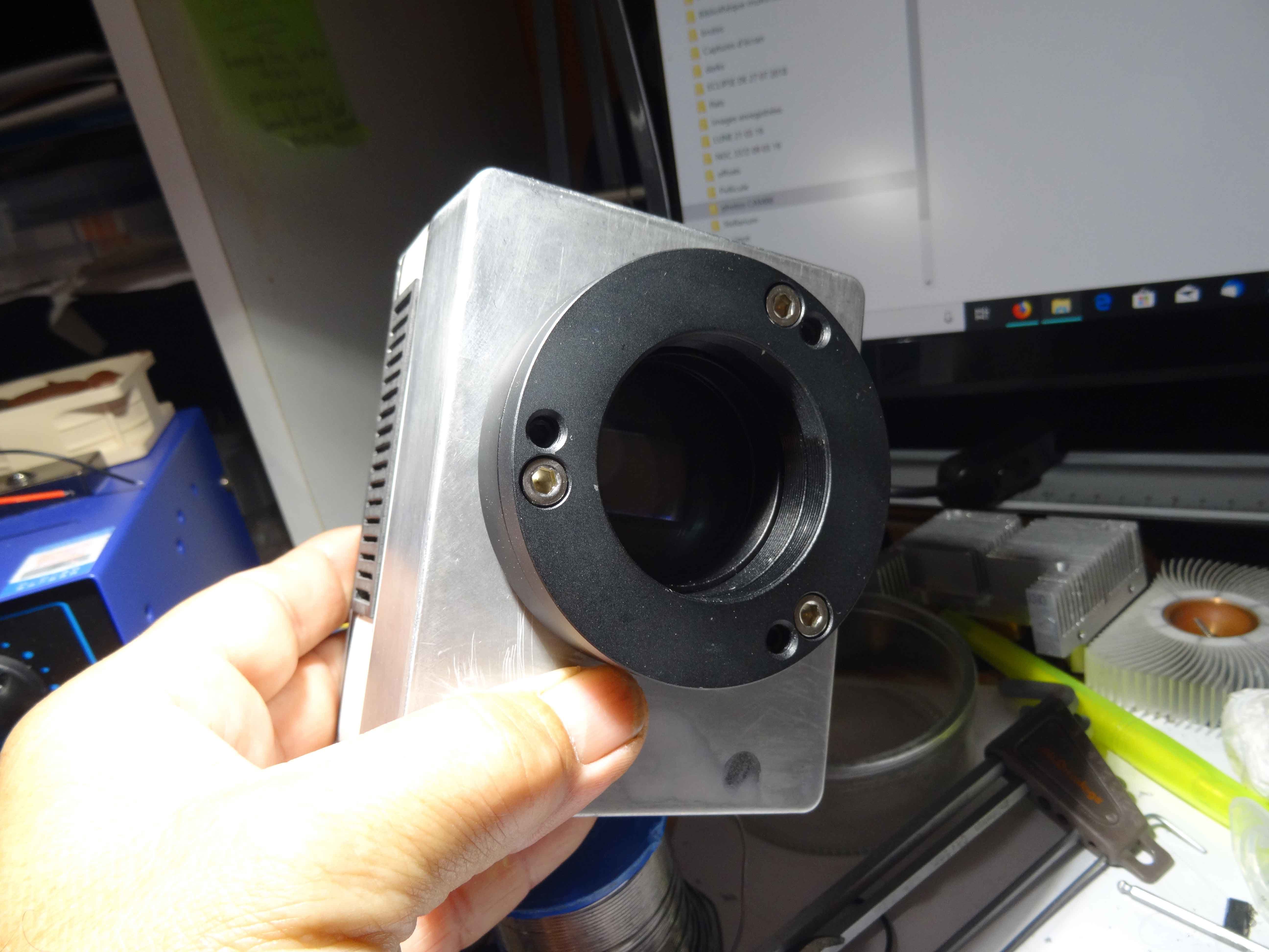 On voit bien ici les grilles d'aération pour le radiateur, l'alésage est celui du ventilateur qui sera en extérieur... mon boitier n'est pas sous argon, c'est le boitier du capteur qui est sous argon...il est indépendant...le radiateur est fixé sous le couvercle et il est comprimé par un jeu de 4 ressorts à la fermeture , ce qui permet un contact constant sur l'arrière du  Peltier... et cela compense la dilatation du doigt chaud sans qu'aucun effort ne s'applique sur la capteur... je détaillerai un peu plus tard en image....le temps pour moi de préparer les photos ( il y en a !!!!)